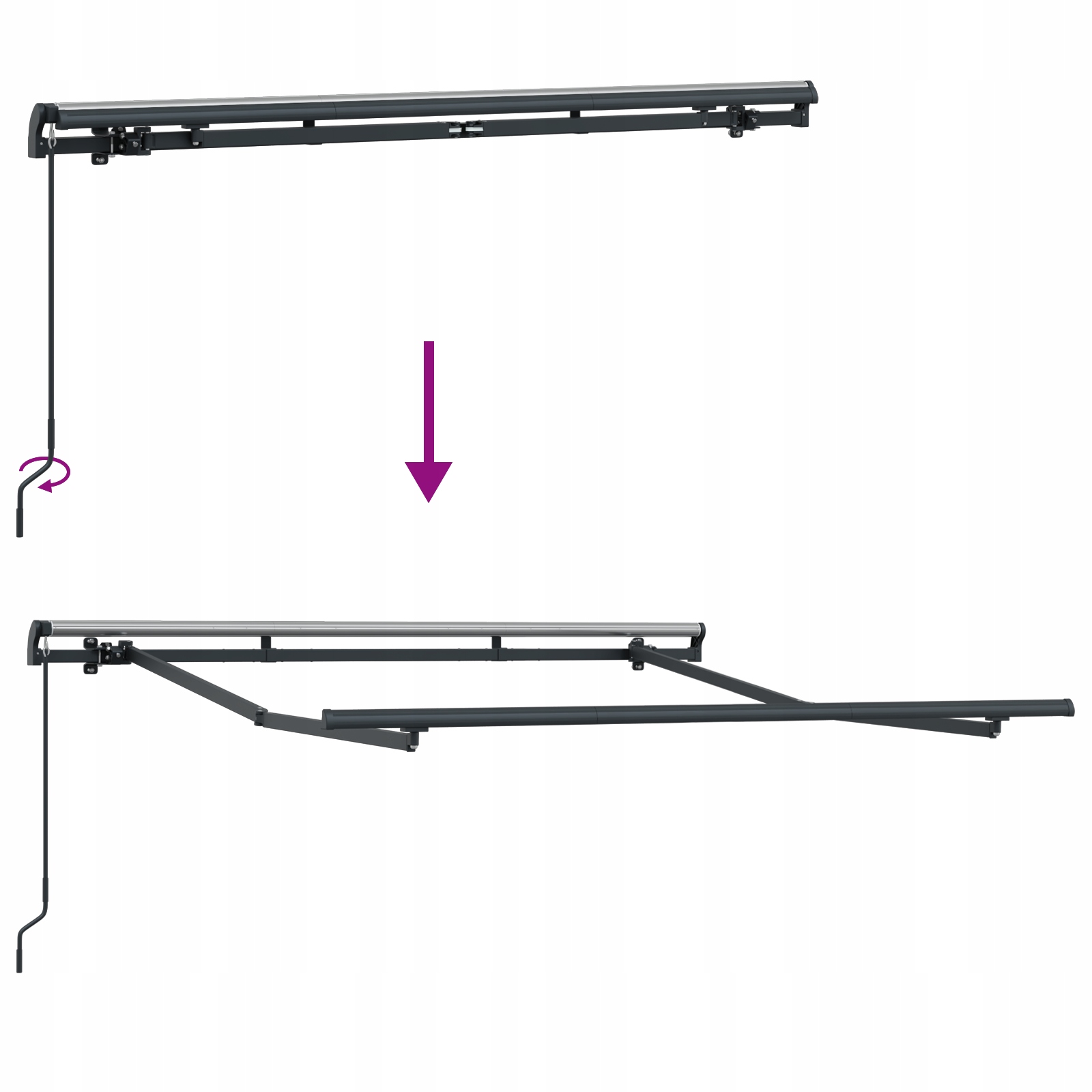 Niebezpieczeństwo! Sprężyny zadziałają mocno po otwarciu. NIE zdejmuj tej liny, chyba że wszystkie etapy montażu zostały zakończone, wszystkie śruby zamocowane, a produkt jest przymocowany do ściany. Ostrzeżenie! Zachowaj ostrożność podczas luzowania ramion, ponieważ są one naprężone! Nagłe zwolnienie ramienia składanej markizy może spowodować obrażenia. Ostrzeżenie: przed rozpoczęciem korzystania z produktu należy przeczytać instrukcję użytkownika. Ostrzeżenie: użytkowanie w czasie mrozu może uszkodzić produkt. Zastosowanie zewnętrzne w budownictwie i innych pracach budowlanych.