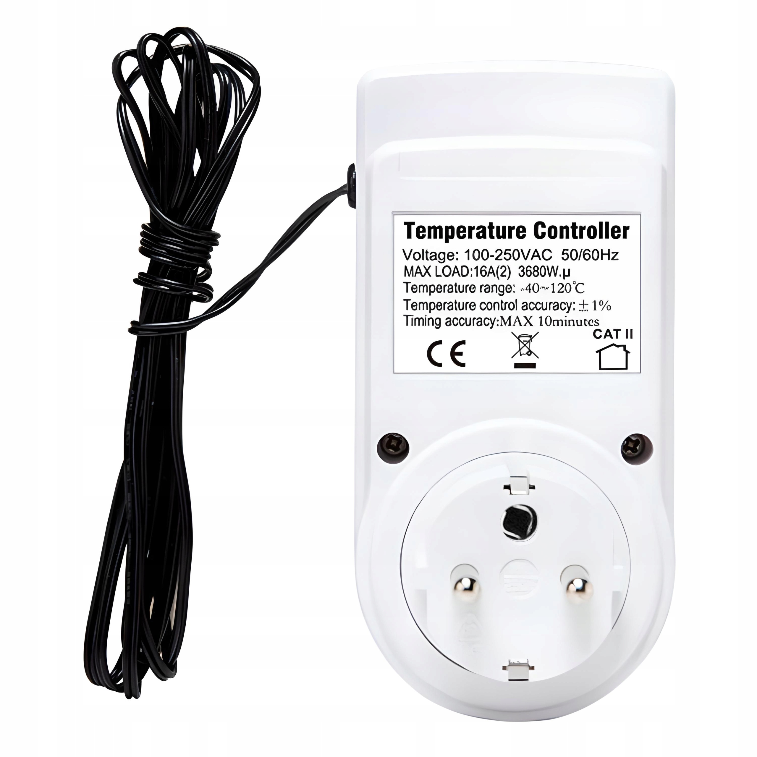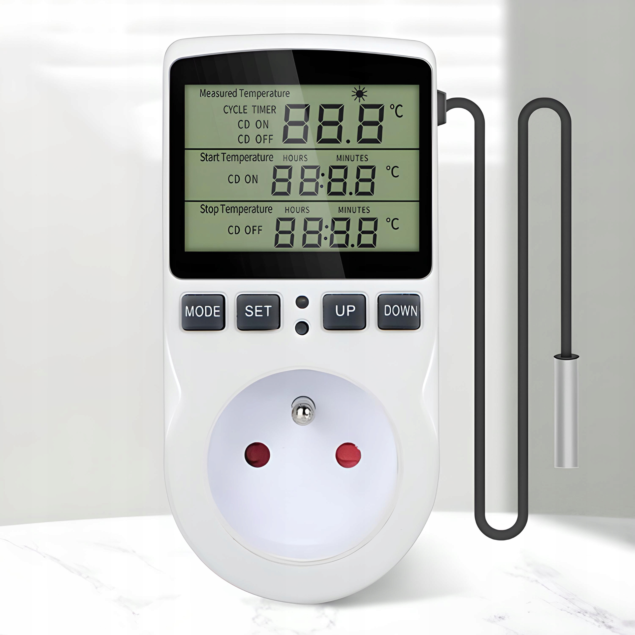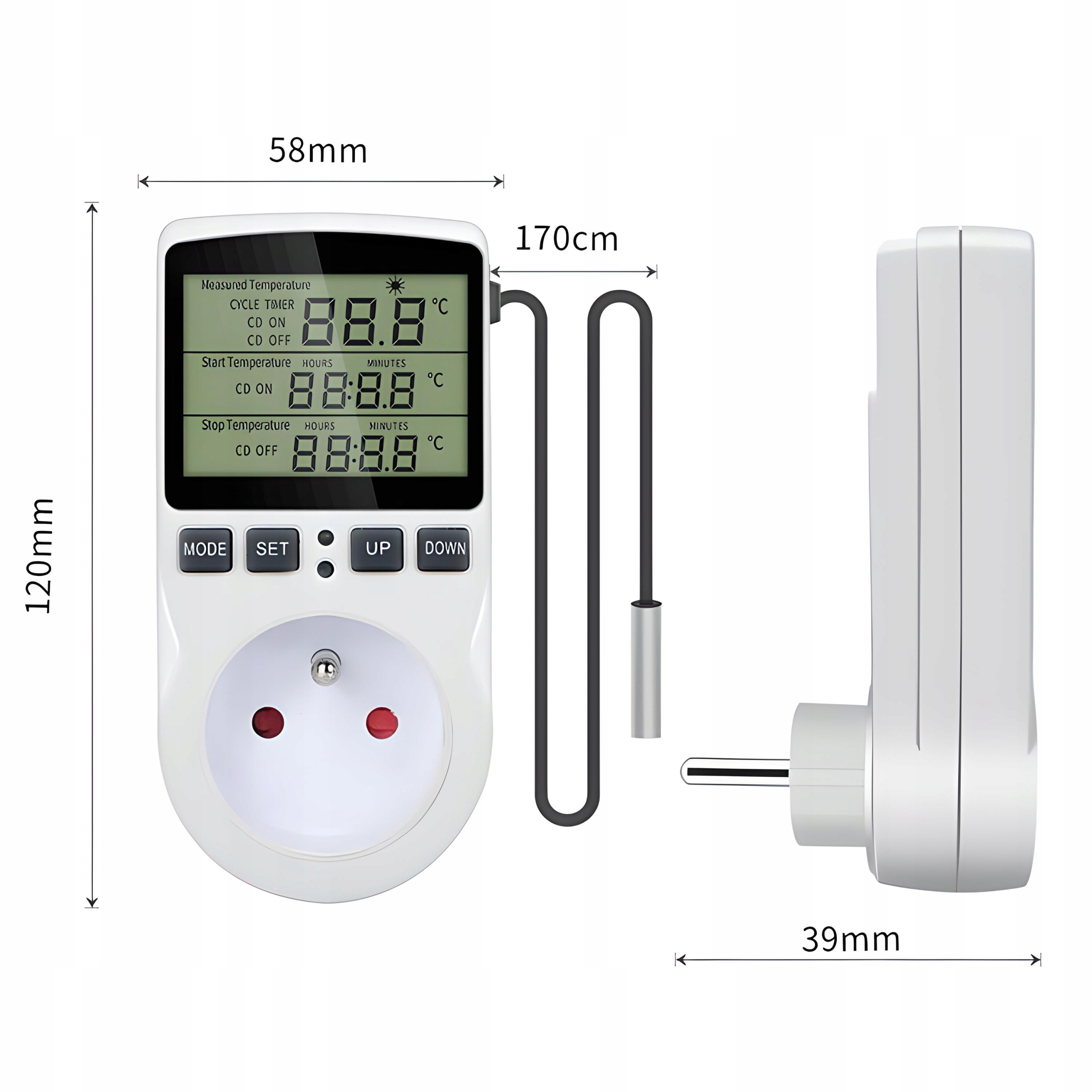 Termostat to narzedzie, które reguluje temperaturę. Posiada sondę/czujnik ogrzewania chłodzenia. Termostat jest niewielkich rozmiarów. Należy wpiąć go w gniazdko elektryczne by automatycznie móc sterować chłodzeniem lub ogrzewaniem. Posiada czytelny wyświetlacz LED.