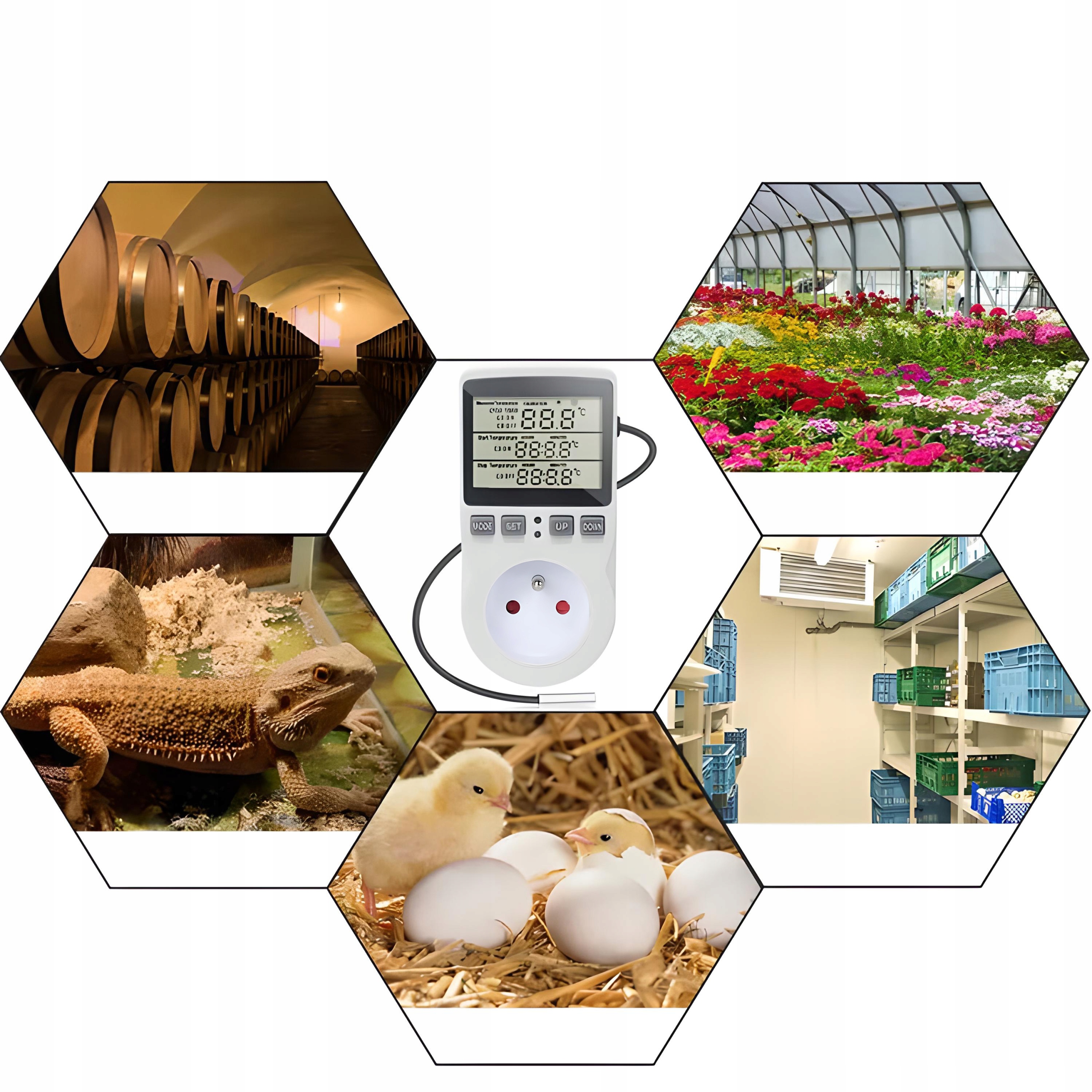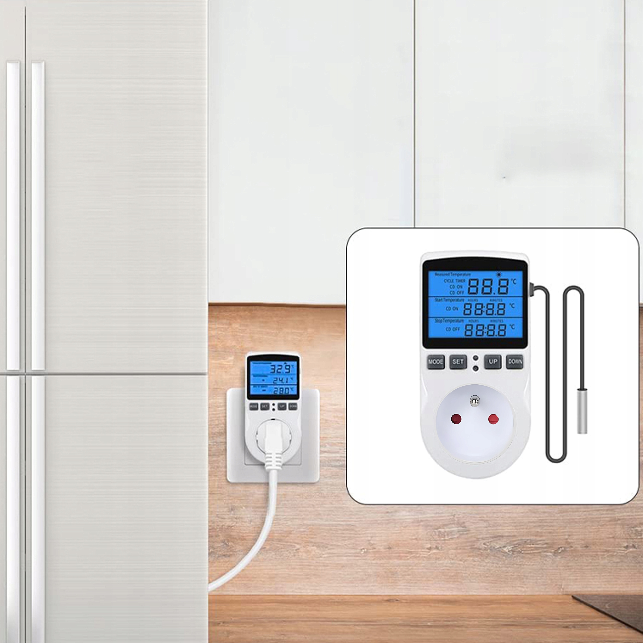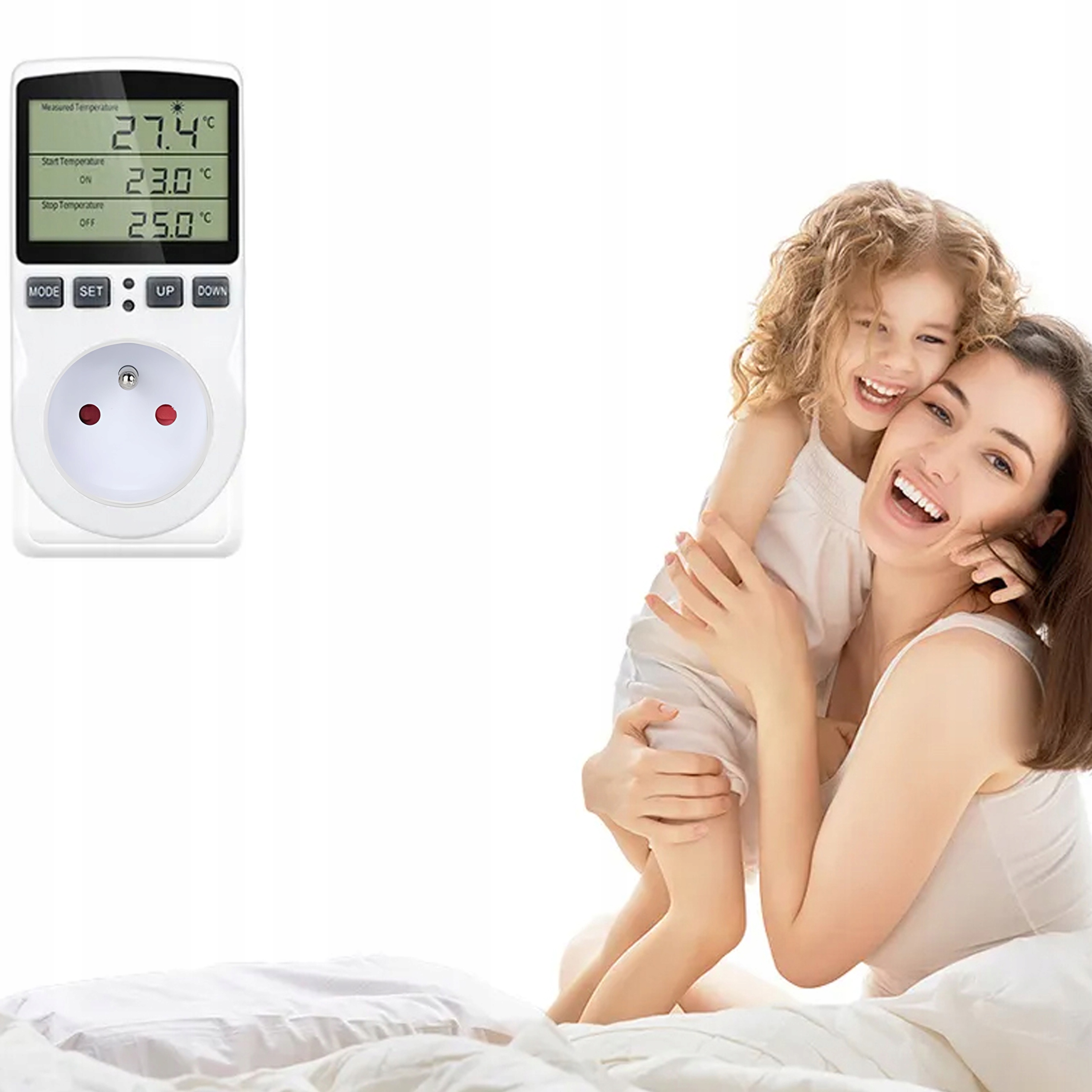 Termostat to narzedzie, które reguluje temperaturę. Posiada sondę/czujnik ogrzewania chłodzenia. Termostat jest niewielkich rozmiarów. Należy wpiąć go w gniazdko elektryczne by automatycznie móc sterować chłodzeniem lub ogrzewaniem. Posiada czytelny wyświetlacz LED.