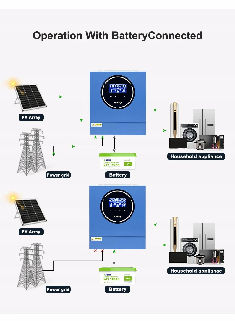 Inwerter zasila podłączone odbiorniki pobierając energię z podłączonych paneli fotowoltaicznych i/lub z podłączonych akumulatorów lub sieci 230V lub innego źródła energii zasilającego napięciem 230V. Jednocześnie pozwala na ładowanie akumulatorów za pomocą podłączonych paneli energią słoneczną lub za pomocą wbudowanej ładowarki sieciowej. Działa z panelami PV (jako przetwornica) lub bez, z siecią 230V (jako UPS). Może pracować bez akumulatorów.
