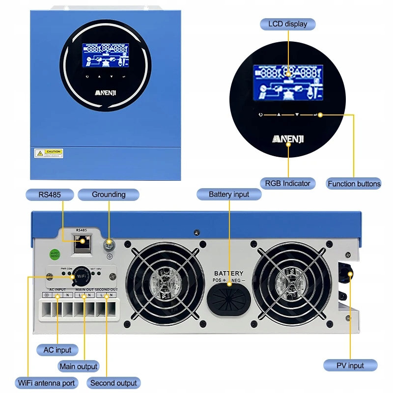 Inwerter jest wyposażony w opcję komunikacji/sterowanie przez WiFi oraz BMS do akumulatorów. Fotowoltaika niskonapięciowa. Praca wyspowa, bez wysyłania prądu do sieci.