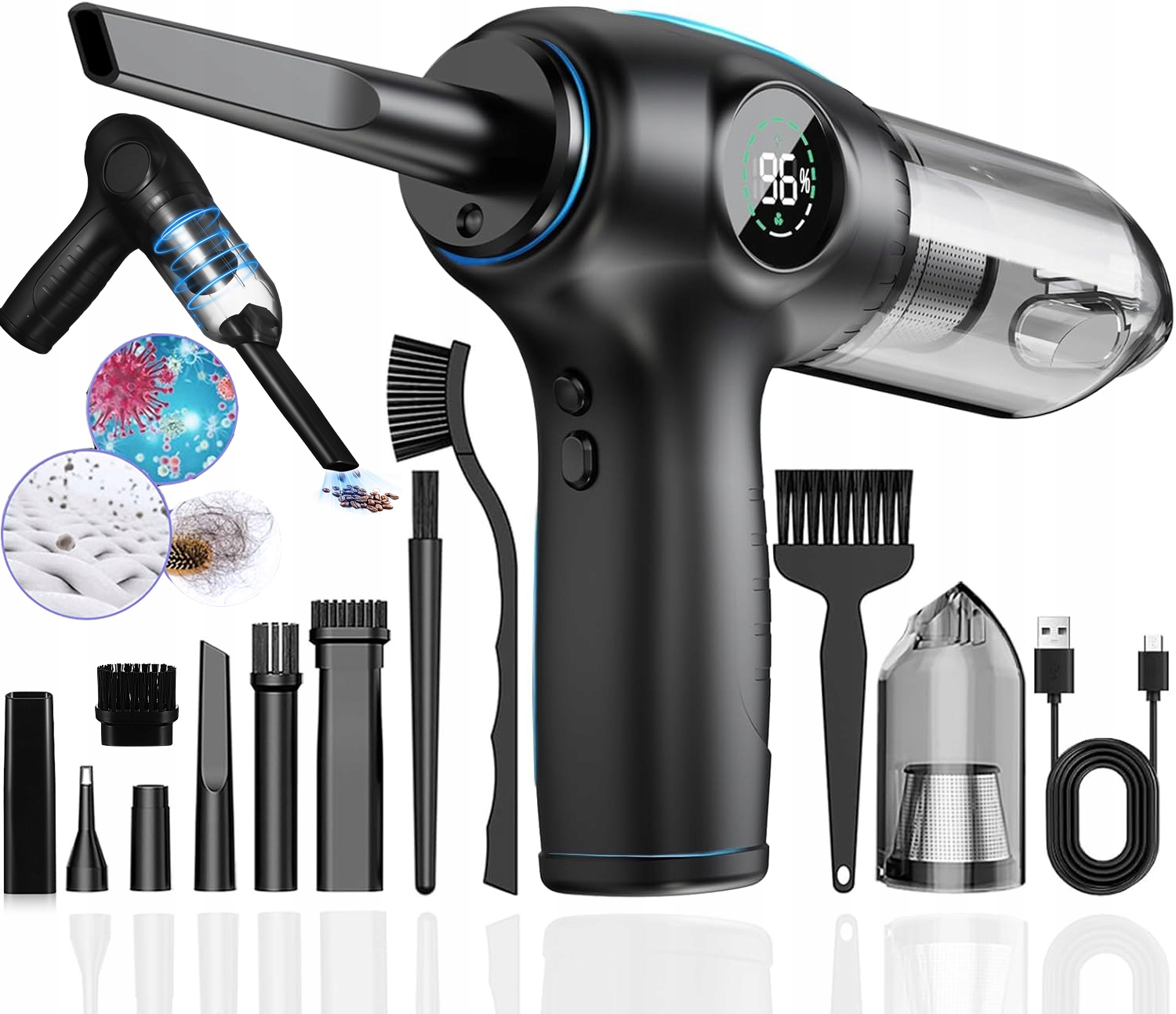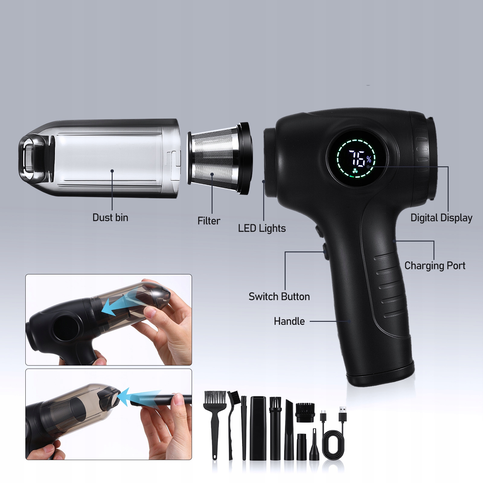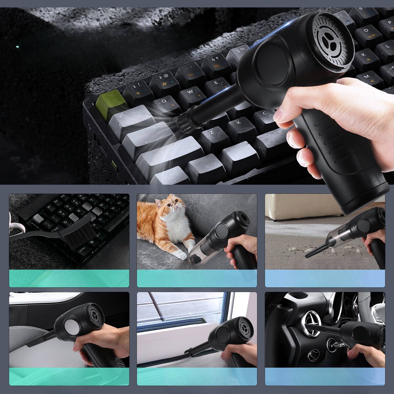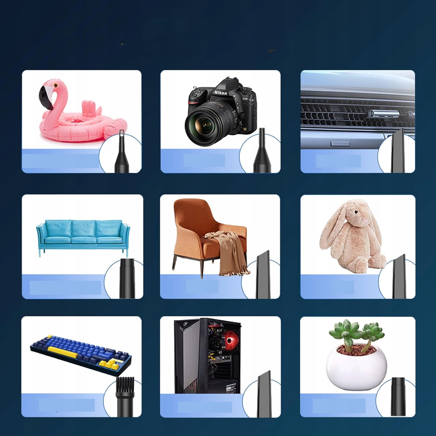 Jego przenośność i wielofunkcyjność sprawiają, że jest idealny do czyszczenia elektroniki, wnętrz samochodów, klawiatur i innych małych powierzchni, do których trudno dotrzeć tradycyjnymi narzędziami czyszczącymi.