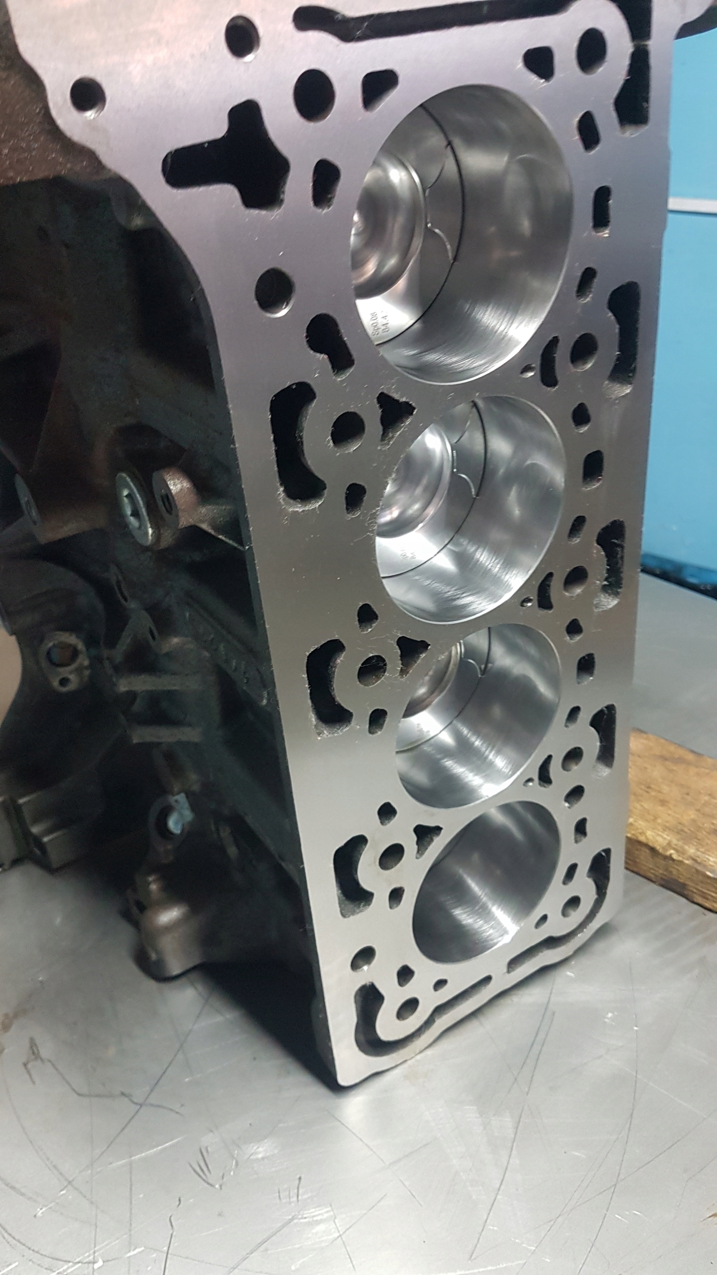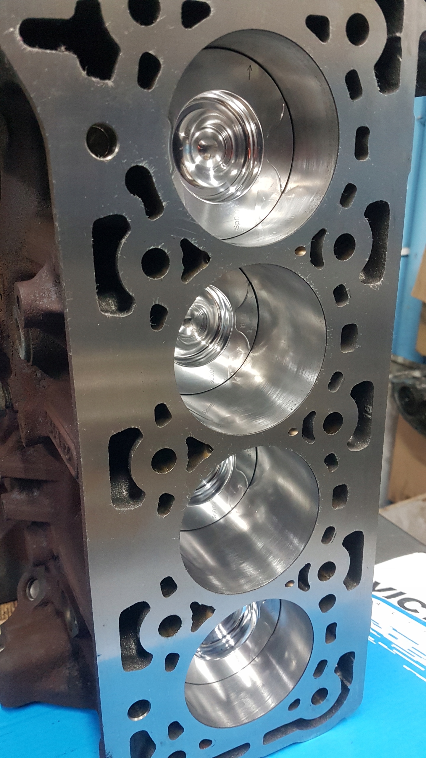 Zdjęcie na którym widać tłoki pokazuje w jaki sposób silnik jest produkowany tworząc część gotowego produktu czyli gotowy silnik jak na zdjęciu nr 1 or 3 pozostałe zdjęcia przedstawiają półprodukt i czynności pomiarowe dokonywane podczas produkcji silnika ECOBLUE