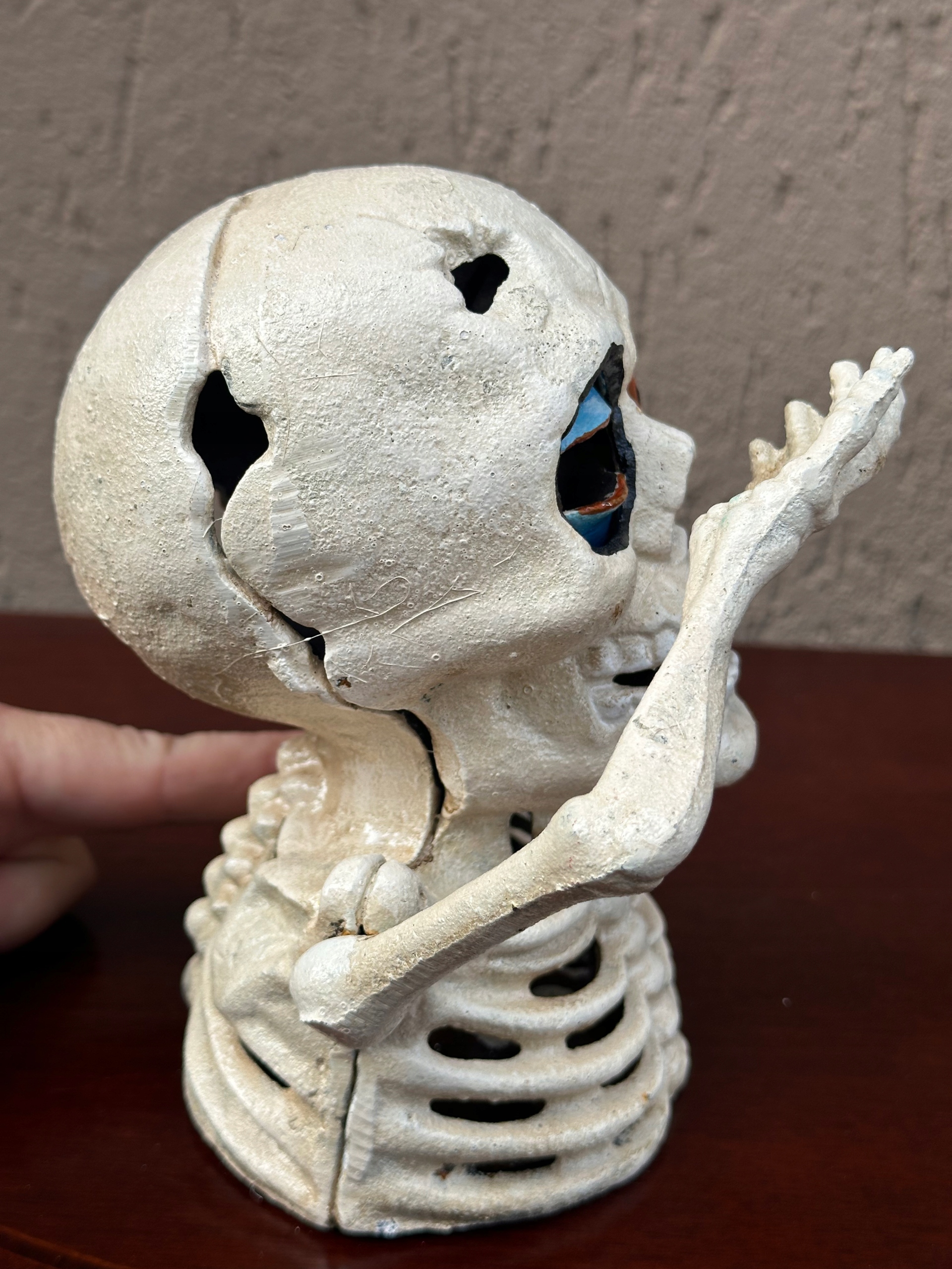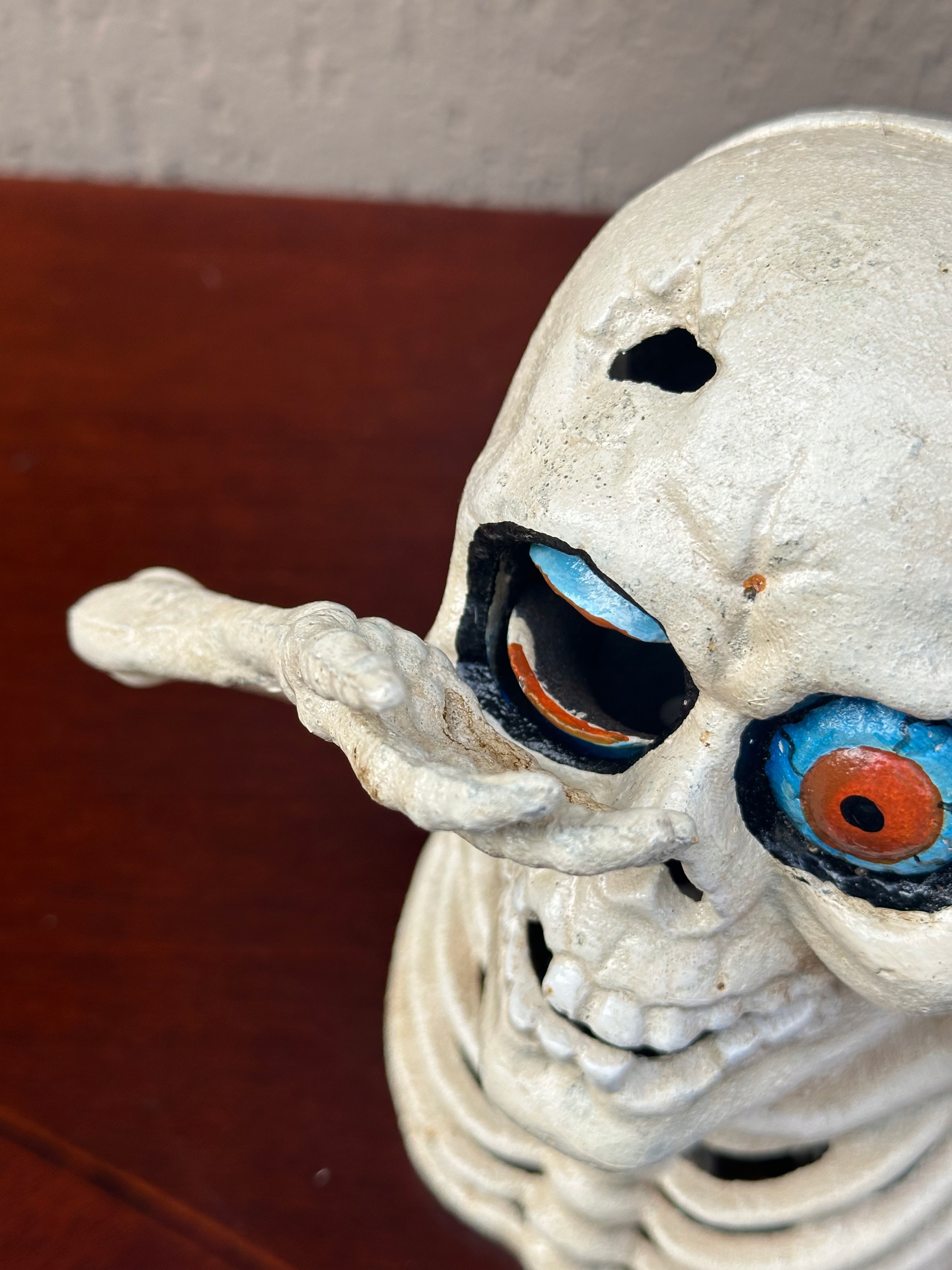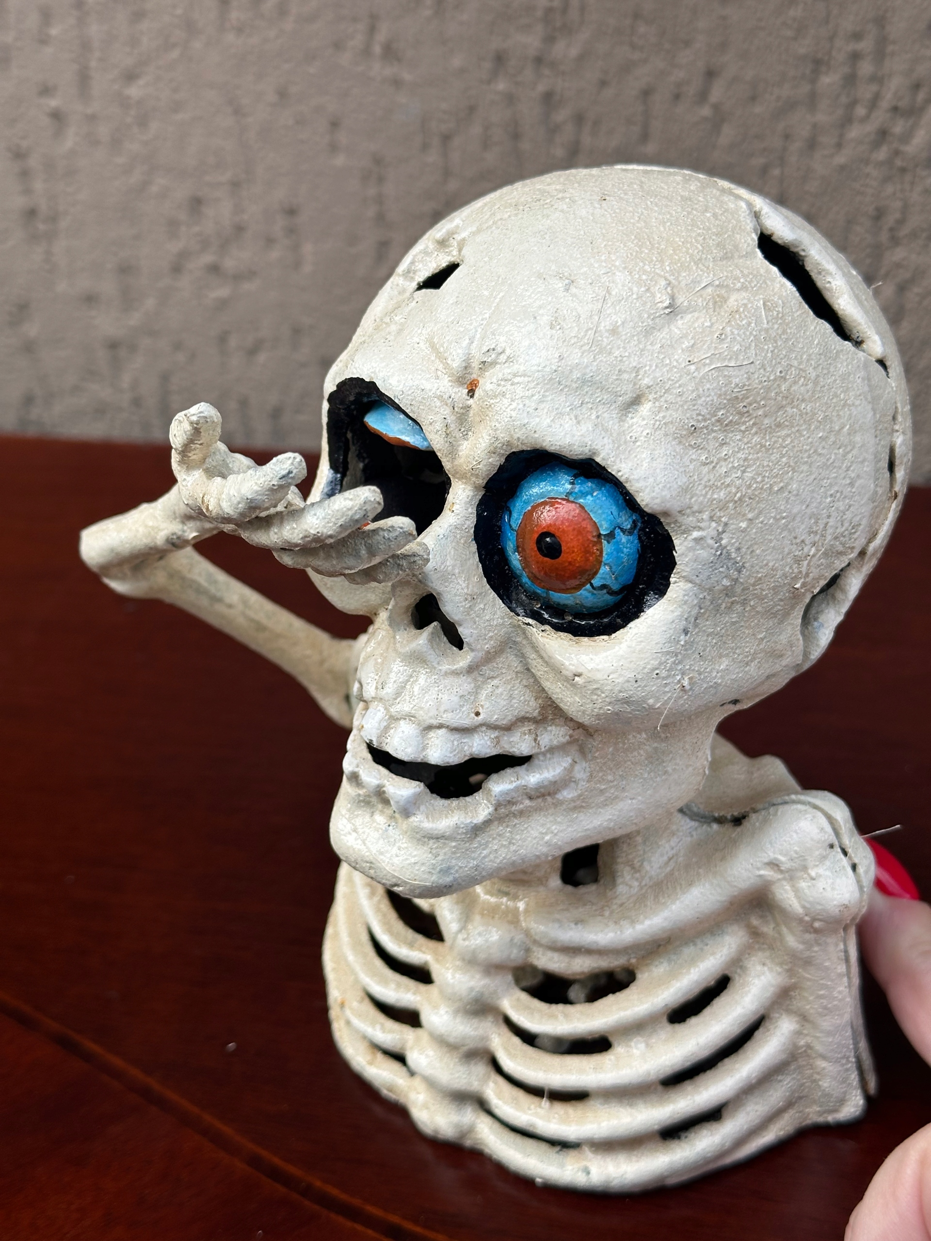 Kościotrup wrzuca monety do oka podnosząc ręke przez naciśnięcie dźwigni z tyłu figurki.