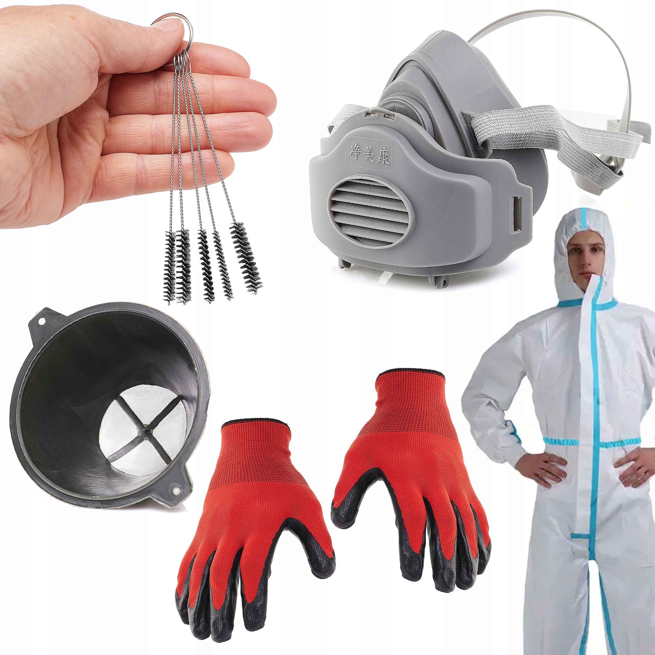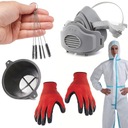 Kompletny zestaw ochronny dla użytkownika agregatu. Kombinezon i rękawiczki osłaniają odzież i dłonie przed farbą, a maska ochrania drogi oddechowe przed rozpylonymi drobinkami farby.