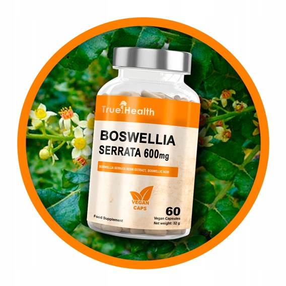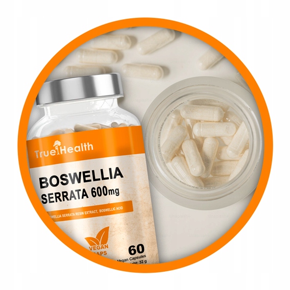 Składniki: Ekstrakt z żywicy Boswellia Serrata standaryzowany na 60% kwas bosweliowy, otoczka kapsułki: hydroksypropylometyloceluloza (HPMC).