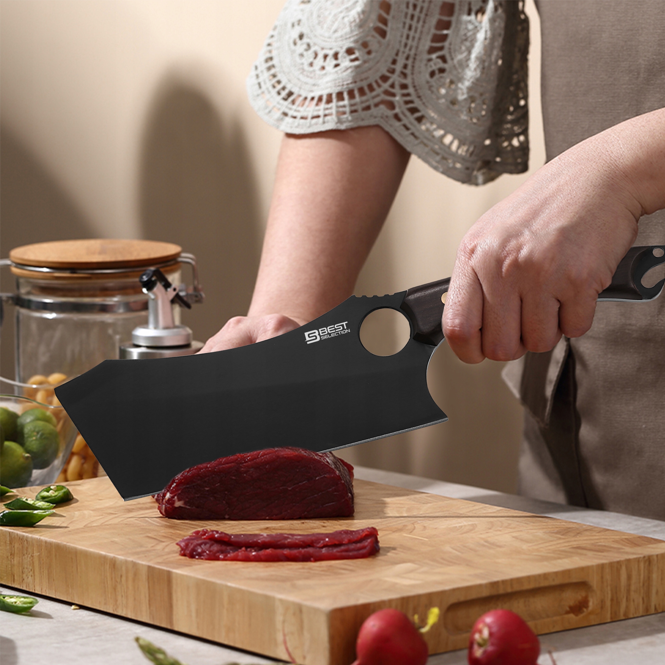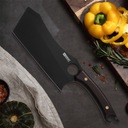 Prezentujemy nóż typu "Cleaver" z niebanalnym i nowoczesnym designem. Czarne, masywne ostrze z unikalnymi wycięciami oraz rękojeść o ergonomicznym kształcie sprawiają, że ten nóż jest nie tylko funkcjonalnym, ale także stylowym dodatkiem do każdej kuchni. Idealny do rozmaitych prac kuchennych takich jak porcjowanie mięsa, krojenie warzyw i wędlin, siekanie itd.