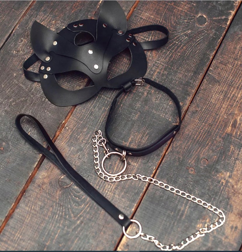 SEKSOWNA SKÓRZANA MASKA + SMYCZ CZARNA BDSM KOBIETA KOT