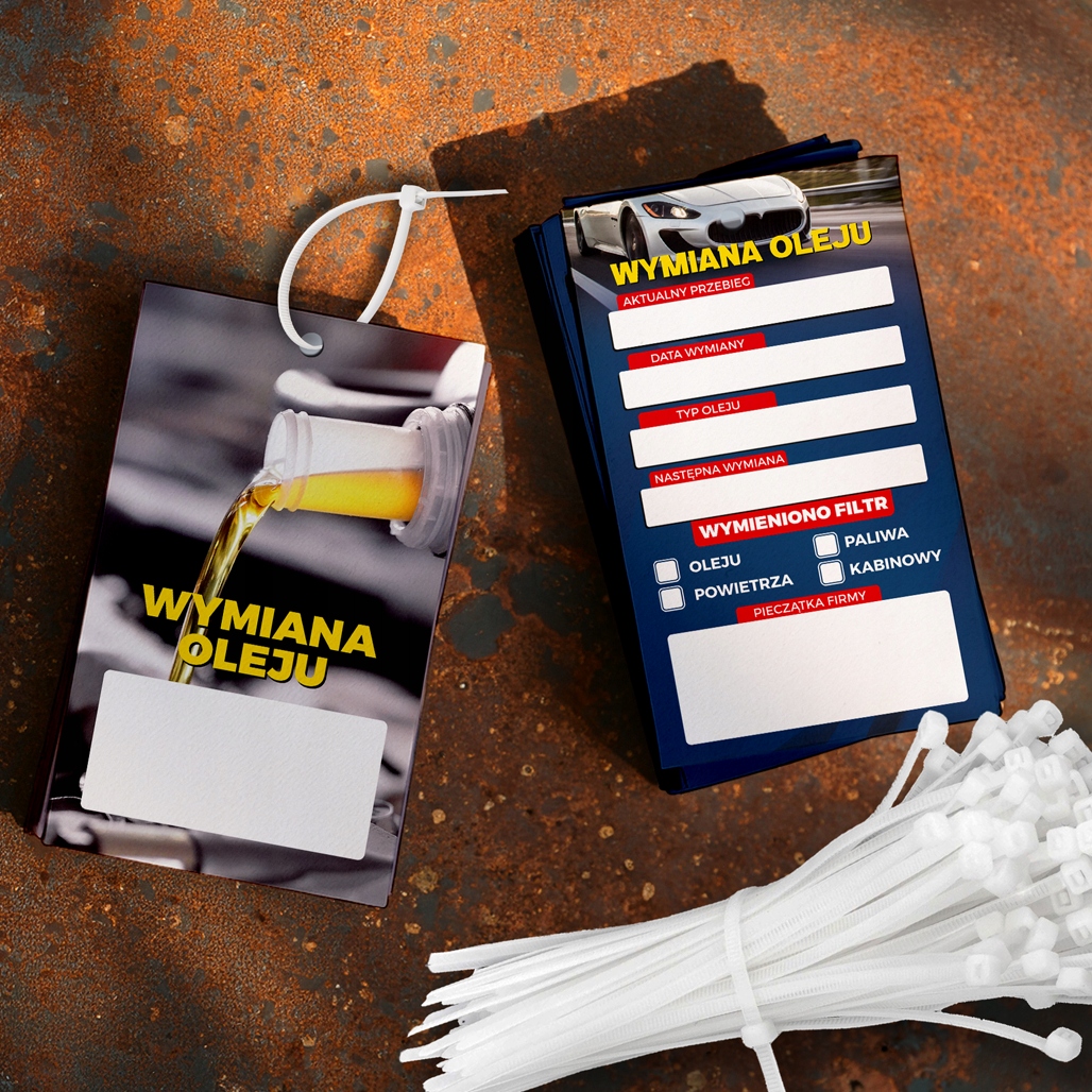 Praktyczne i estetyczne zawieszki serwisowe, idealne do oznaczania wykonanych przeglądów – takich jak wymiana oleju czy filtrów. To niezawodne narzędzie dla każdego warsztatu, który ceni sobie porządek, precyzję i profesjonalny wizerunek. Dzięki nim szybko oznaczysz wykonane usługi i pokażesz klientowi dbałość o każdy szczegół.