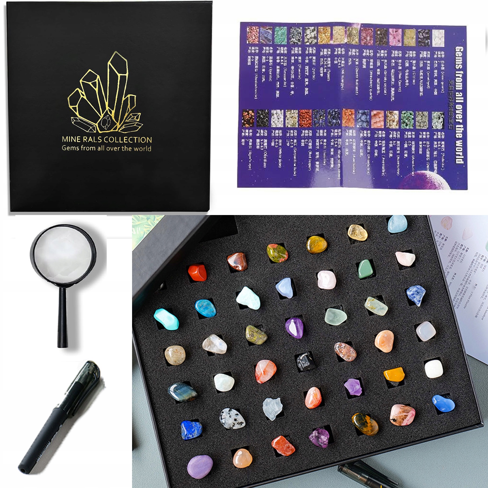 ✅w zestawie lupa do oglądania eksponatów, długopis do sporządzania notatek, ulotka z nazwami kamieni.