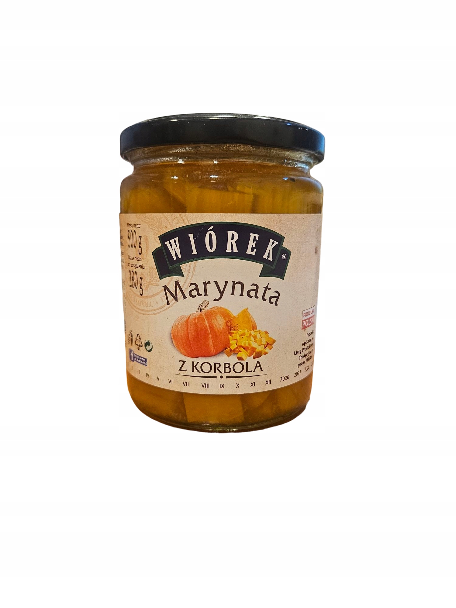 MARYNATA Z KORBOLA WIÓREK 500G czyli marynowana dynia, to prawdziwy przysmak dla miłośników naturalnych i tradycyjnych smaków. Dzięki unikalnemu połączeniu dyni, octu, aromatycznych przypraw i lekkiej słodyczy, tworzy wyjątkowy dodatek do wielu dań. Idealna do pieczonych i grillowanych mięs, doskonała w duecie z serami, ciekawy dodatek do sałatek i przystawek.