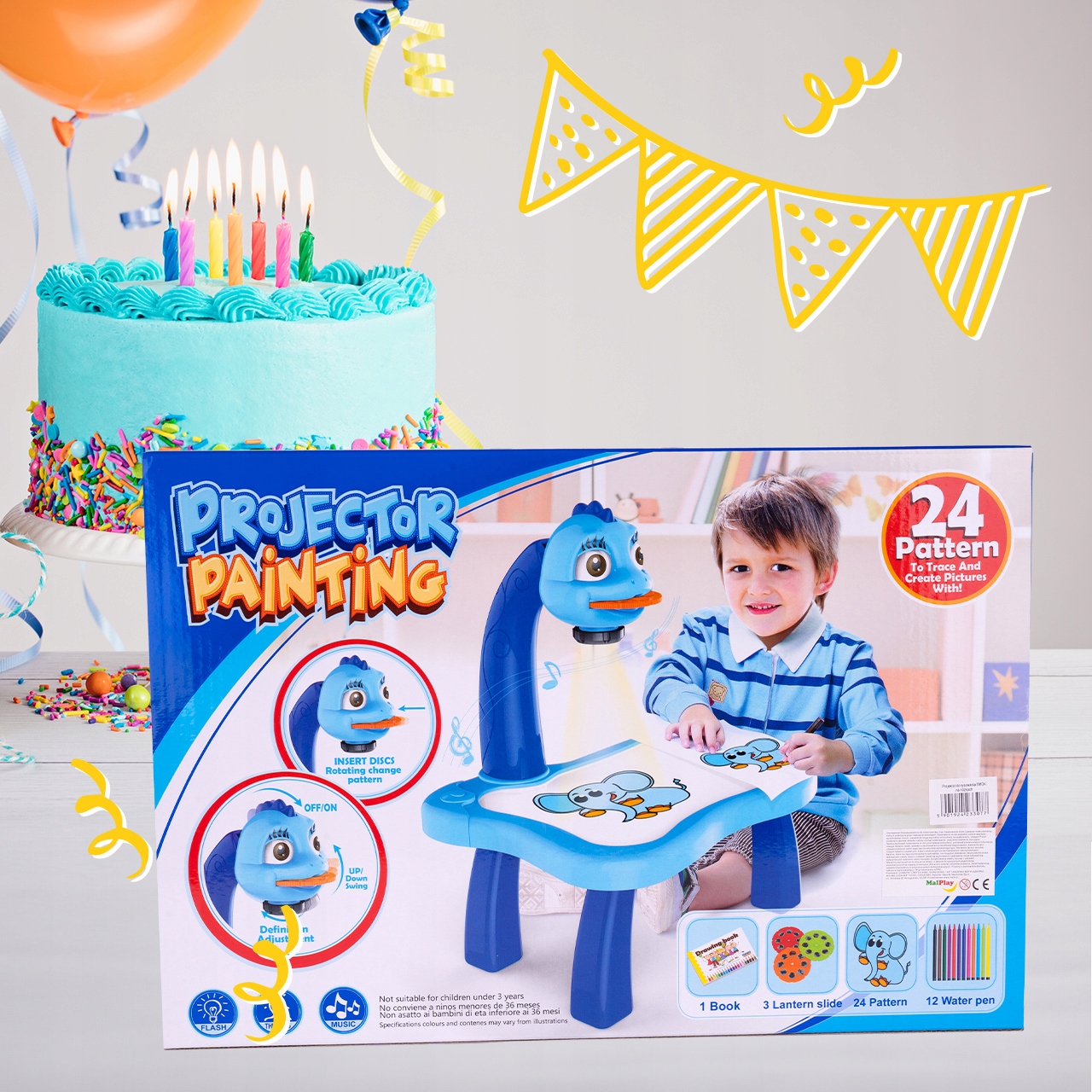 Wszystkie dzieci uwielbiają rysować. Ten rzutnik umożliwia stworzenie pięknych obrazków za pomocą światła! Do rzutnika dołączone są aż 3 wymienne dyski, a na każdym z nich jest po 8 różnych wzorów. Łącznie dziecko może nauczyć się rysować aż 24 różne rzeczy lub np. tworzyć kolaże!