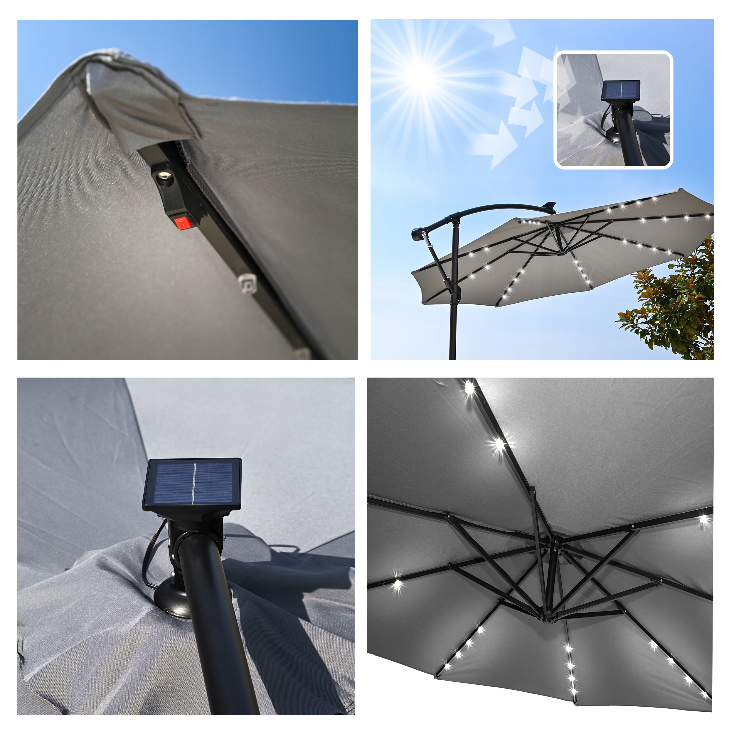 Parasol został wyposażony w zintegrowane lampki LED zasilane energią słoneczną, które automatycznie włączają się po zmroku. Tworzą one przyjemną, klimatyczną atmosferę, idealną na wieczorne spotkania na świeżym powietrzu – bez konieczności podłączania do prądu.