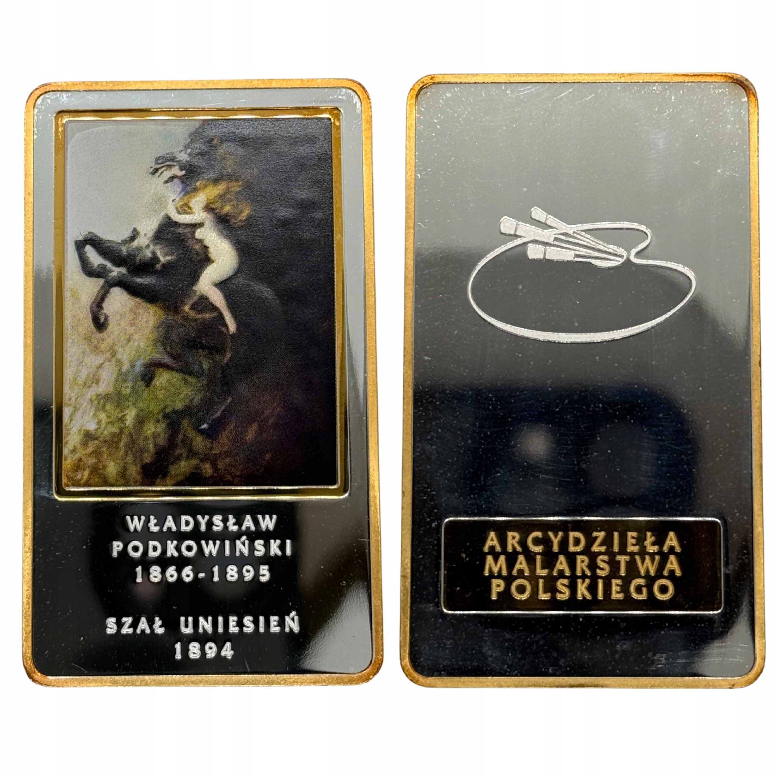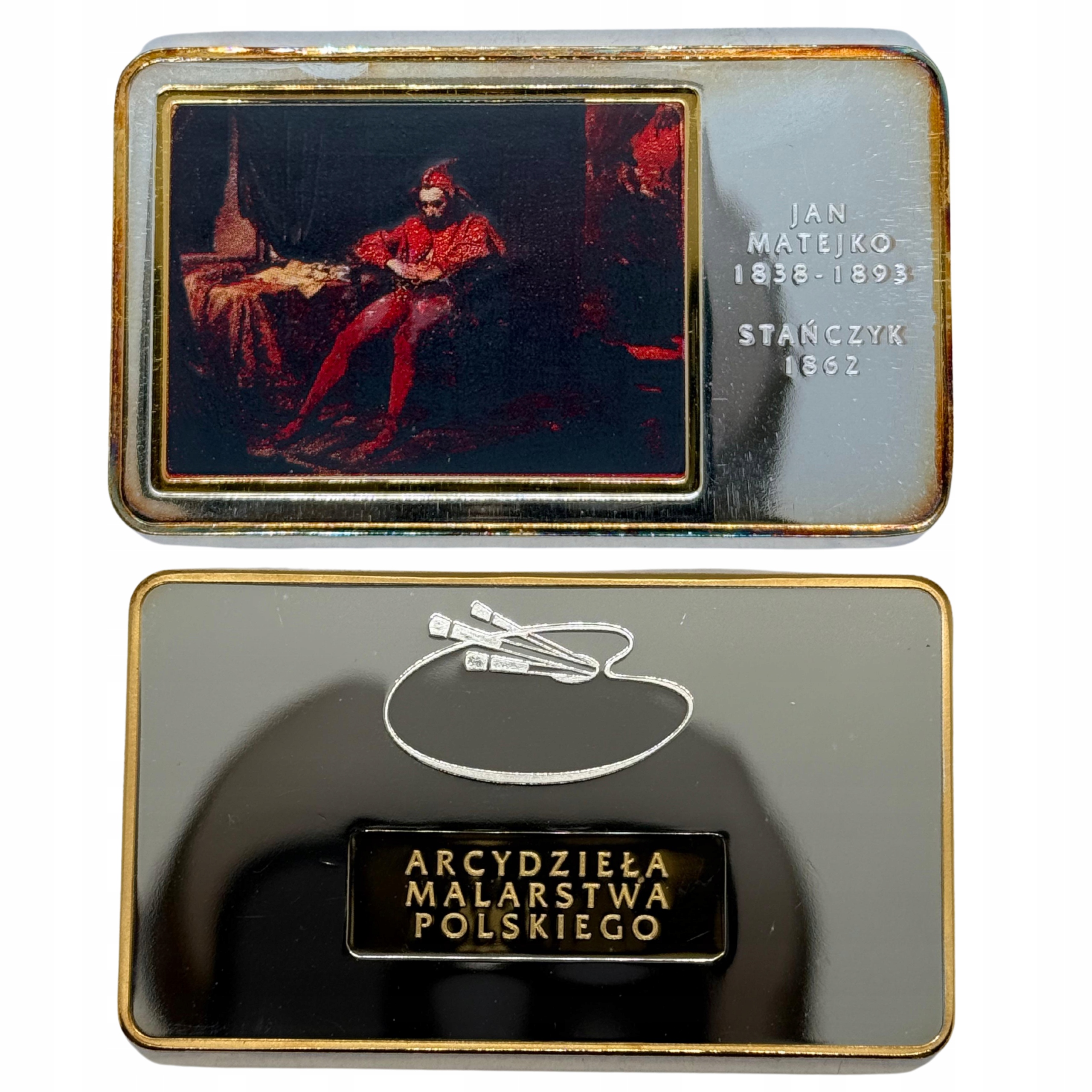Prezentujemy Państwu zestaw numizmatów z serii - Arcydzieła Malarstwa Polskiego. W zestawie znajduję się 10 sztabek wykonanych z miedzi platerowanych srebrem próby 999 oraz 24-karatowym złotem. Do zestawu dołączona jest dedykowana, elegancka kasetka wykonana z drewna. Na sztabkach znajdują się najznakomitsze obrazy, najpopularniejszych polskich artystów, takich jak: Wojciech Kossak, Józef Chełmoński, Leon Wyczółkowski, Aleksander Gierymski, Józef Pankiewicz, Władysław Podkowiński, Stanisław Wyspiański, Stanisław Ignacy Witkiewicz oraz Jacek Malczewski.