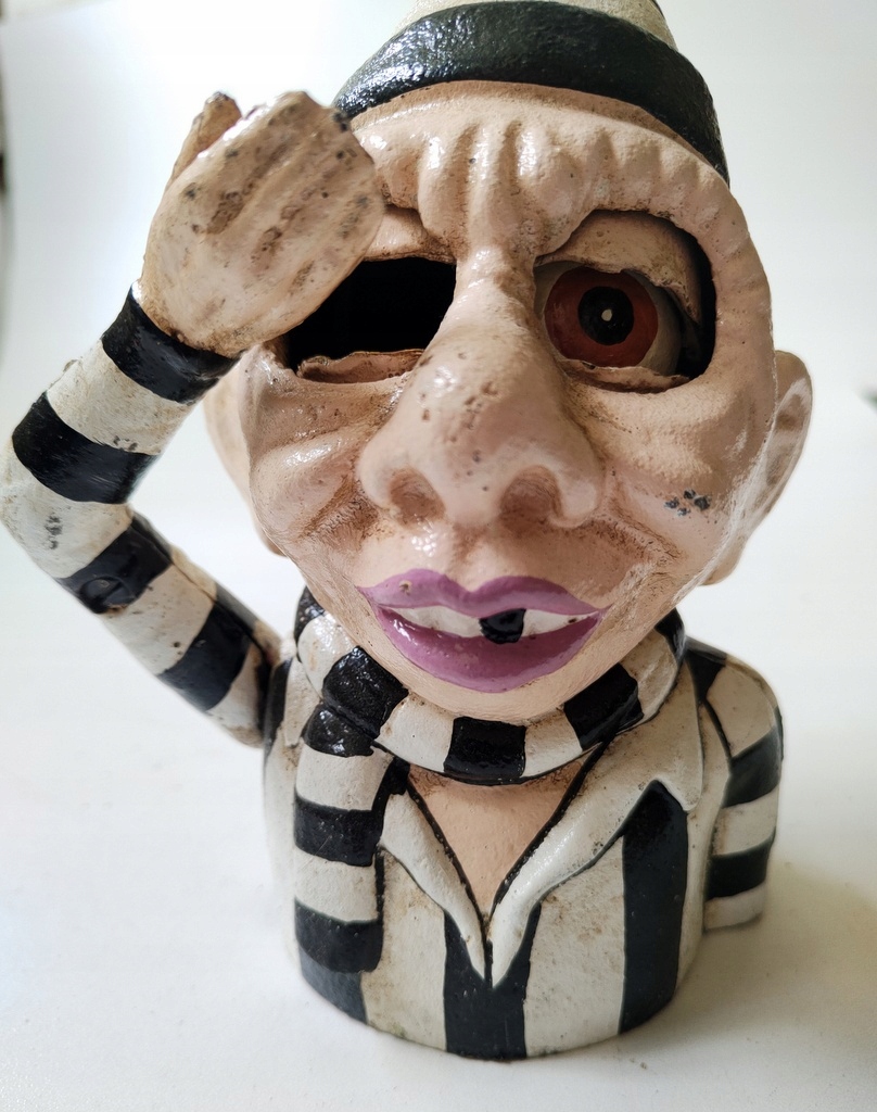 Wykonana z żeliwa przedstawiająca więźnia w pasiakach jako skarbonkę. Po naciśnięciu dźwigni Pan podnosi dłoń, na której kładzie się monetę a on wrzuca do oka, które automatycznie się otwierają.