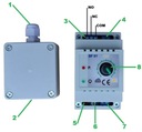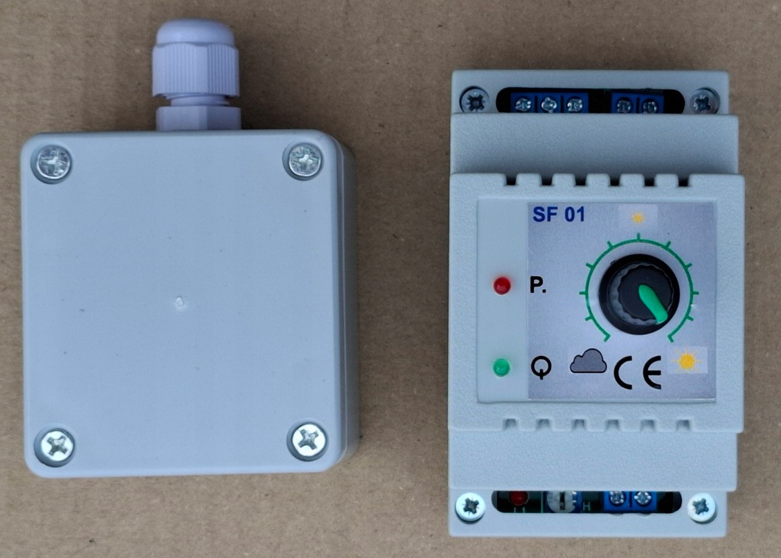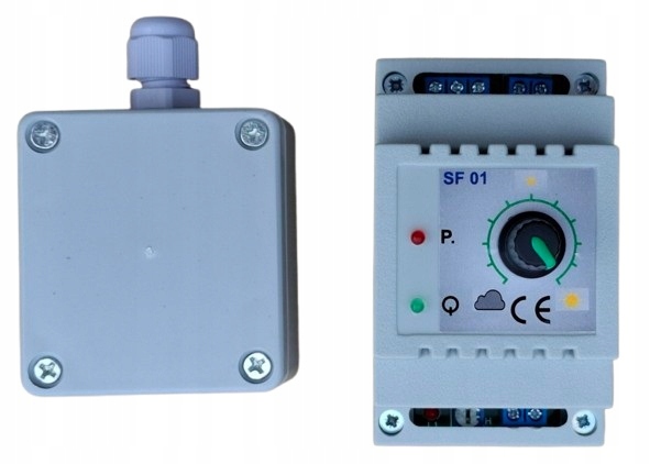 Czujnik posiada wejście przewodu (dławik) (1) oraz okno pomiarowe – światłoczułe (2) po przeciwnej stronie obudowy. Natomiast sterownik wyposażono w złącze zasilania 230V samego sterownika (4), złącze przekaźnika (wyjście przekaźnikowe beznapięciowe) (3) i złącze przewodu czujnika (7). Sterownik SF01 posiada też pokrętło ustawienia progu załączenia (8), regulację histerezy progu wyłączenia (6) oraz diodę kontrolną LED1 (5). Na przednim panelu są też diody LED: zielona zasilania oraz czerwona załączenia przekaźnika.