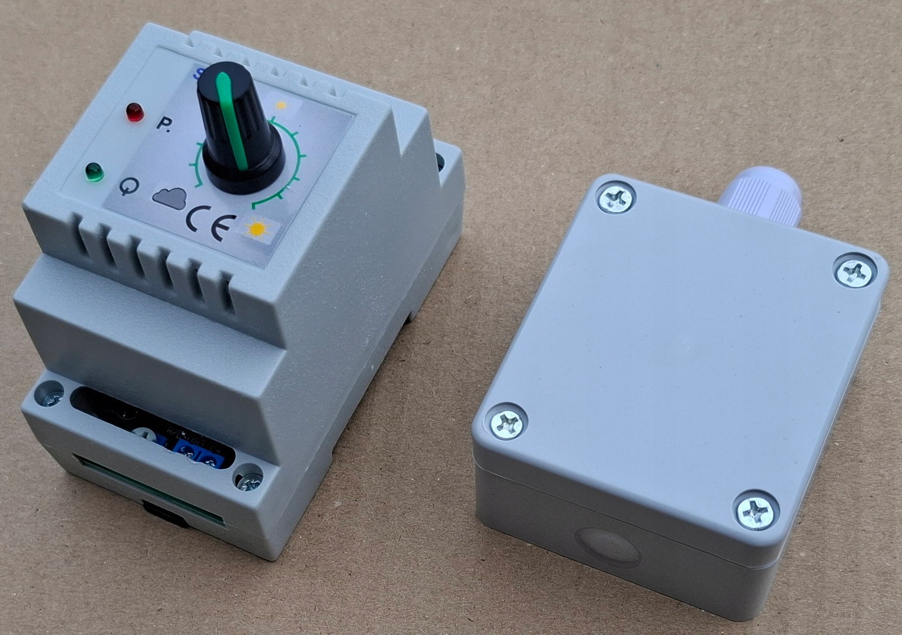 Cały komplet składa się ze sterownika właściwego oraz czujnika oświetlenia. Czujnik łączymy ze sterownikiem okrągłym przewodem 2 żyłowym o przekroju minimum 0,5mm2.