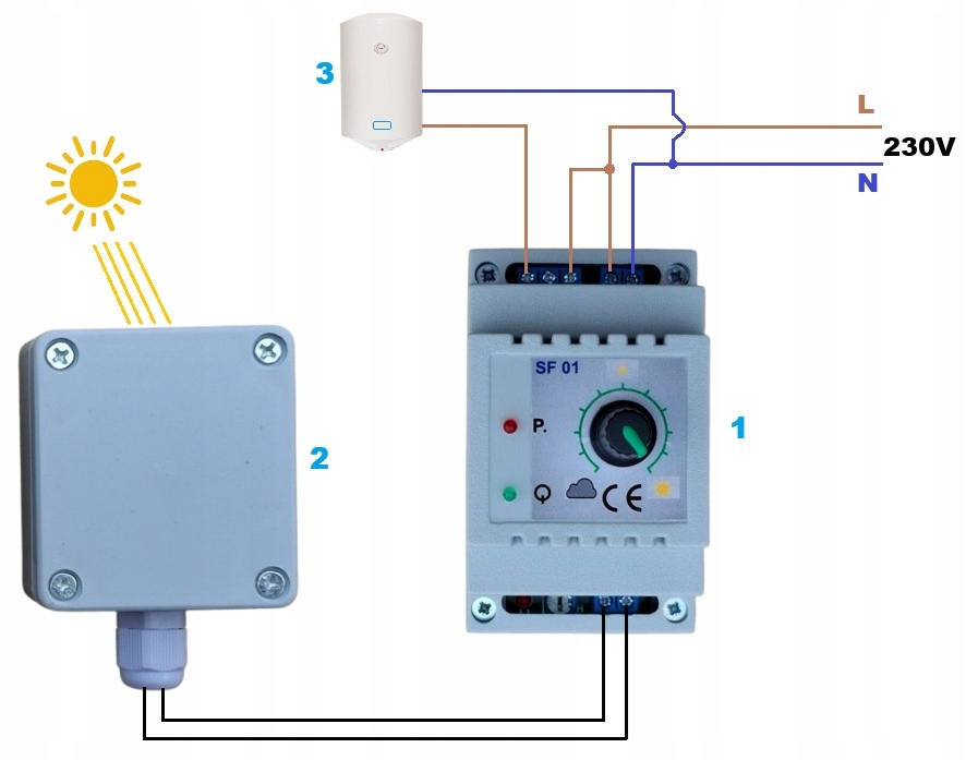 Sterownik SF01 umożliwia automatyczne załączenie odbiornika (np. bojler elektryczny) podczas dużego nasłonecznienia (duża produkcja z paneli) oraz odłączenie odbiornika gdy słońce zajdzie za chmury. Pomaga to lepiej wykorzystać potencjał instalacji fotowoltaicznej – zwiększa auto konsumpcję.