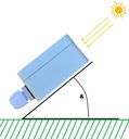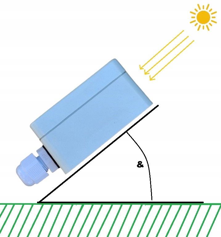 Czujnik montujemy na zewnątrz, zwykle w pobliżu paneli fotowoltaicznych, tak by w momencie dnia o najwyższej produkcji prądu światłoczułe okno czujnika „patrzyło” na słońce. Czujnik mocujemy wyjściem przewodu w dół, zwykle czujnik jest mocowany pod kątem & 20-50 stopni od poziomu jak na rysunku obok.