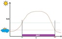 Poniższy wykres pokazuje charakterystykę pracy. Po wschodzie słońca poziom nasłonecznienia stopniowo rośnie (brązowa zakrzywiona linia), odbiornik jest wyłączony, a gdy nasłonecznienie osiągnie poziom załączenia (zielona pozioma linia), zaczyna migać dioda LED1 i jeśli nasłonecznienie utrzyma się w sposób ciągły powyżej tego progu przez czas około 6 sekund to załączy się wbudowany przekaźnik (punkt ON) – nasz odbiornik jest teraz zasilany (LED1 oraz czerwona led na obudowie świeci na stałe).