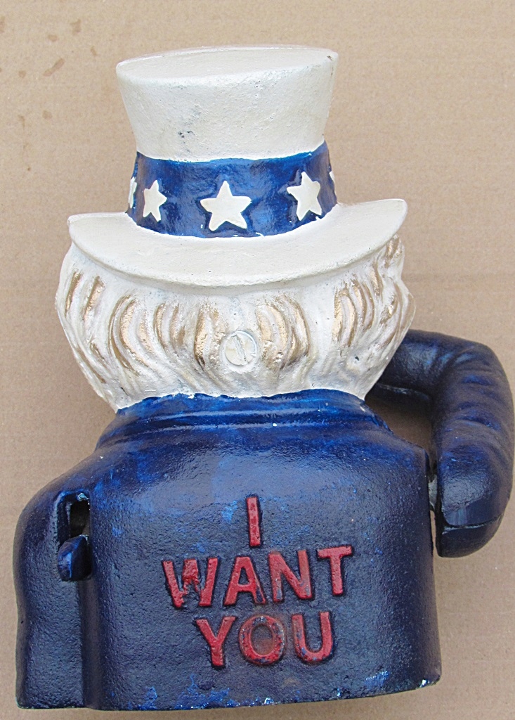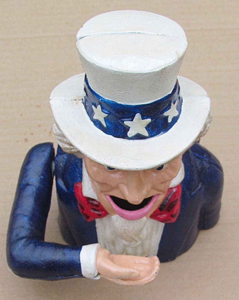 Wykonana z żeliwa przedstawiająca starszego Pana jako skarbonkę . Po naciśnięciu dźwigni Pan podnosi dłoń na której kładzie się pieniążka a on wrzuca do ust ,które automatycznie się otwierają .