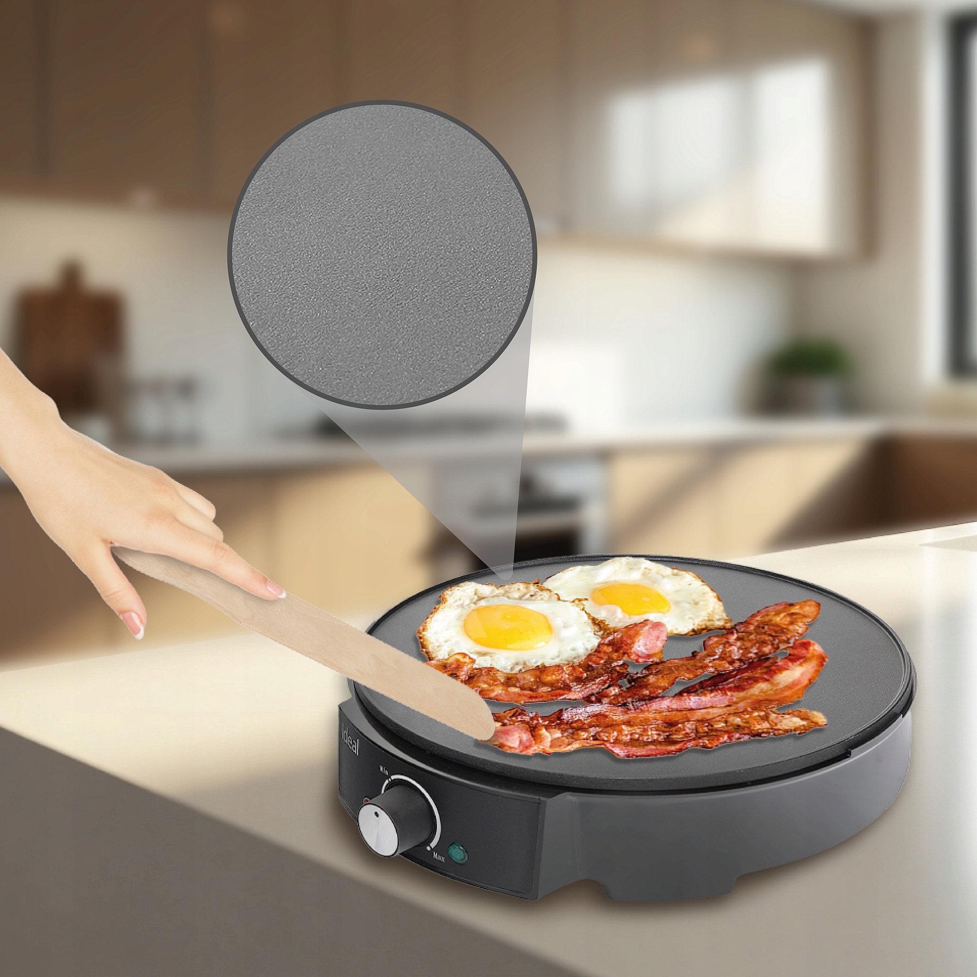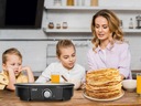 Dzięki specjalnej, nieprzywierającej powierzchni grzejnej o średnicy 30 cm możesz bez obaw smażyć naleśniki – ciasto nie przykleja się do płyty, a naleśniki łatwo się od niej odklejają. Równomierne nagrzewanie sprawia, że każdy placek jest idealnie wypieczony i przygotowanie ich staje się szybkie i wygodne. Możesz upiec nie tylko naleśniki ale również inne smakołyki -np. jajka sadzone i inne.