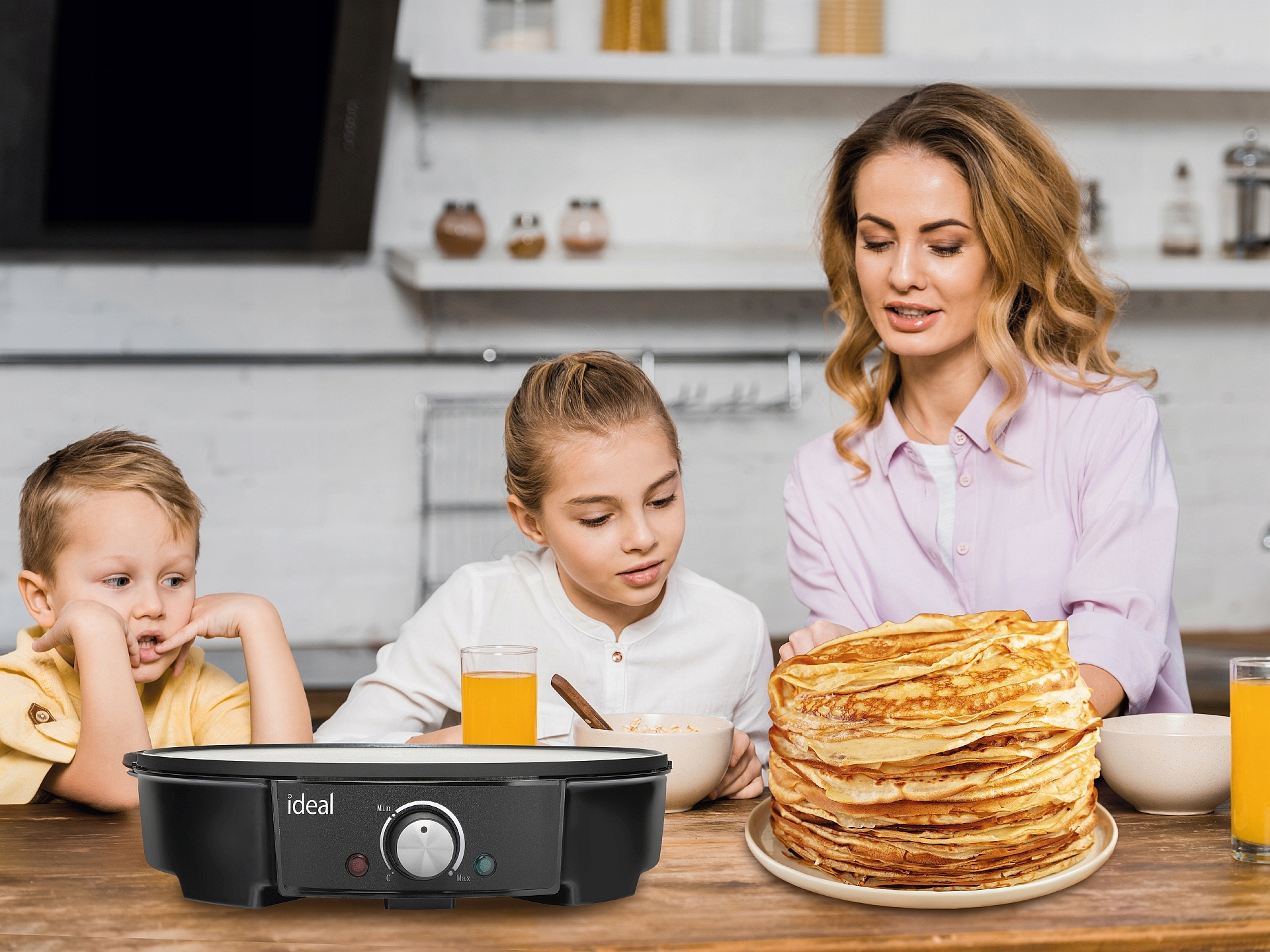 Elektryczna naleśnikarka Ideal to świetne rozwiązanie zarówno dla wprawionych kucharzy, jak i osób, które dopiero zaczynają gotować. Dzięki intuicyjnej obsłudze sprawdzi się w każdej kuchni – niezależnie od doświadczenia. Z tym urządzeniem smażenie naleśników staje się szybkie, łatwe i naprawdę przyjemne!