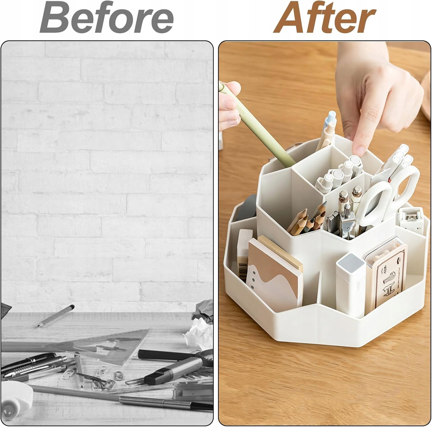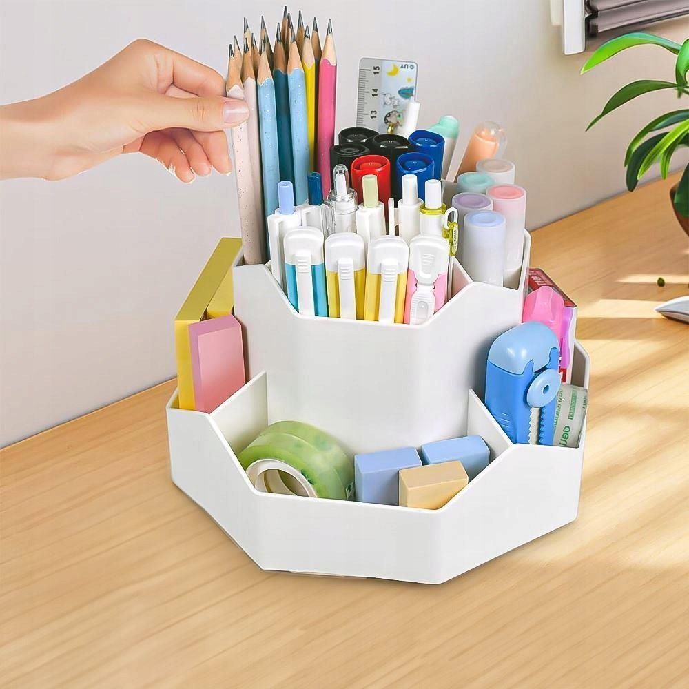 Wygodna, obrotowa podstawa umożliwia 360-stopniowy obrót, zapewniając Ci błyskawiczny dostęp do wszystkich przechowywanych artykułów. Płynny ruch bez zacięć czy drżenia pozwoli Ci sprawnie sięgnąć po długopis, linijkę lub inne potrzebne akcesoria.