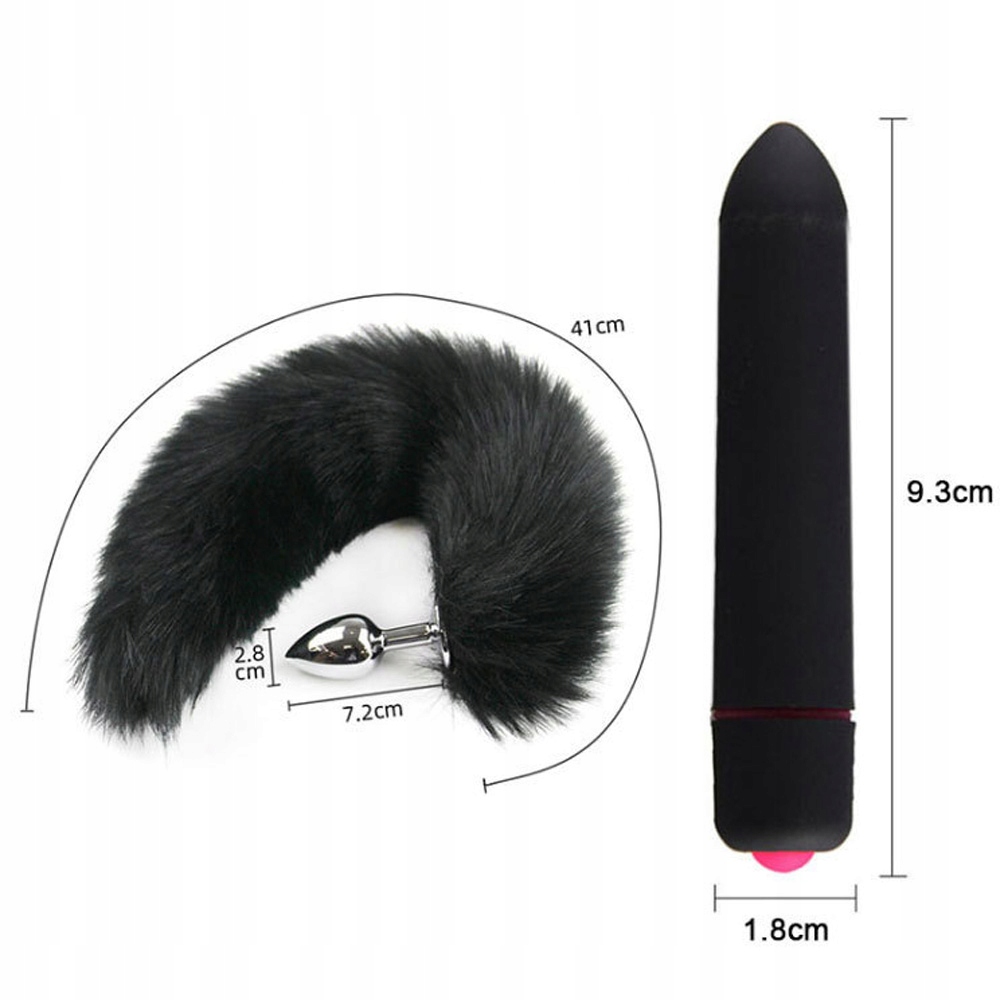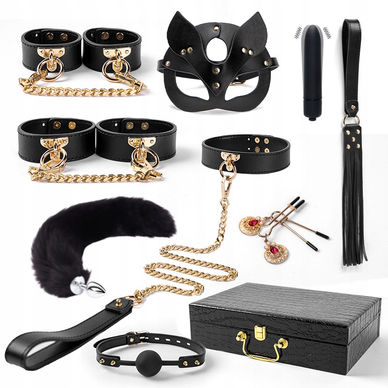 Zestaw BDSM - ten zestaw BDSM zawiera 9 części: parę kajdanek, parę mankietów na nogi, knebel kulkowy, kołnierz, opaskę na oczy, bicz, wtyczkę do tyłka, smycz, wibrator 10-częstotliwościowy, bicz i dwa zaciski na sutki.