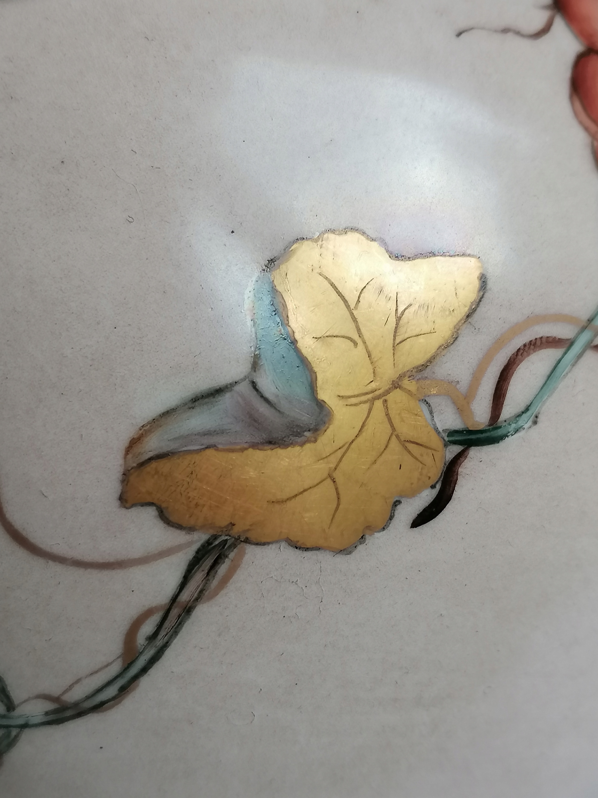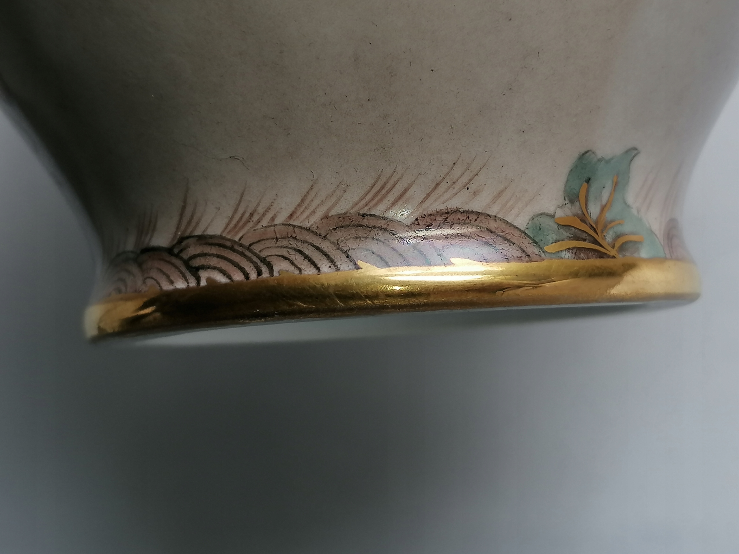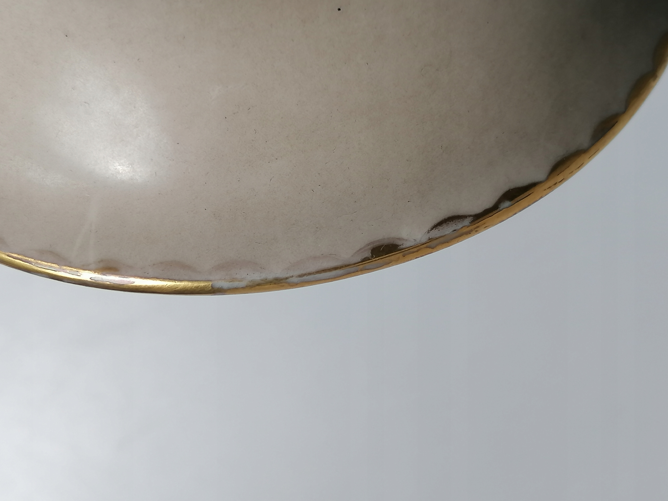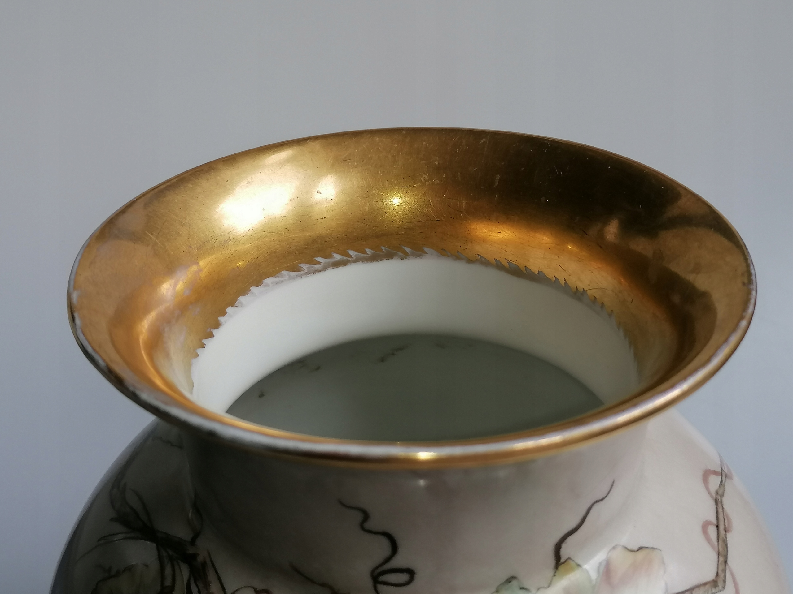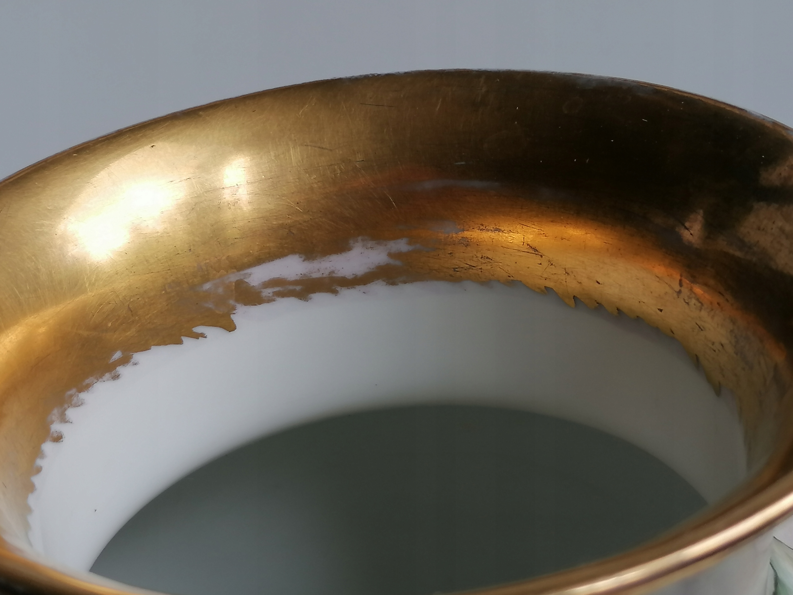 Stan bardzo dobry, wręcz idealny, porcelana oraz zdobienia bardzo dobrze zachowane, jedynie lekkie przetarcia złocenia od wewnętrznej oraz spodniej strony wylewu.