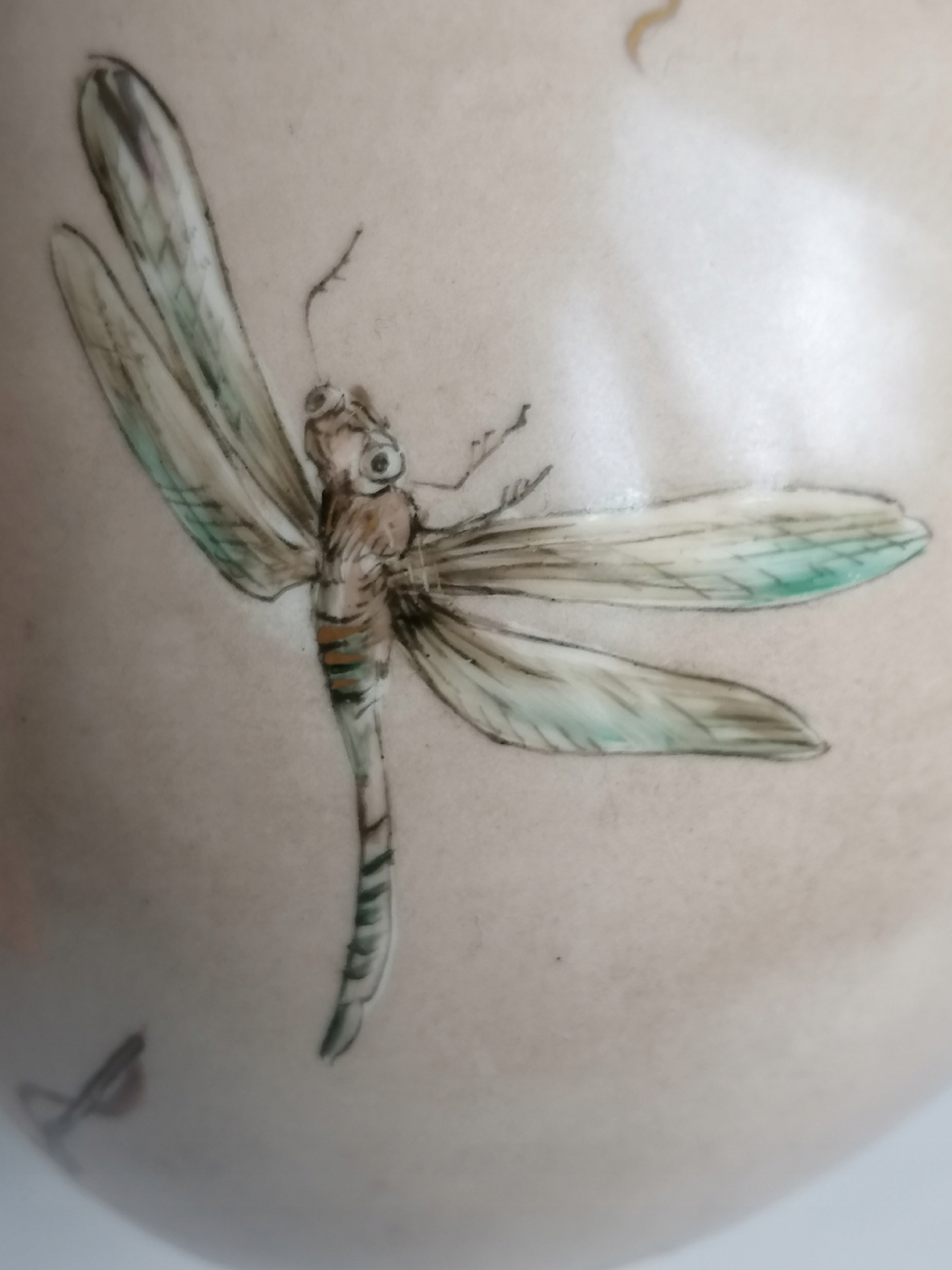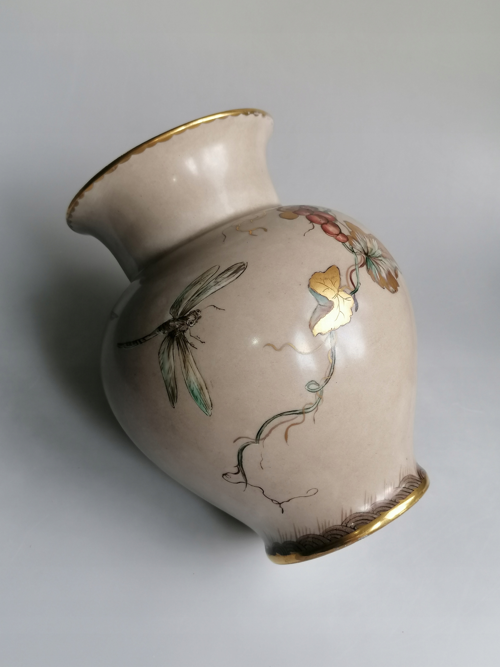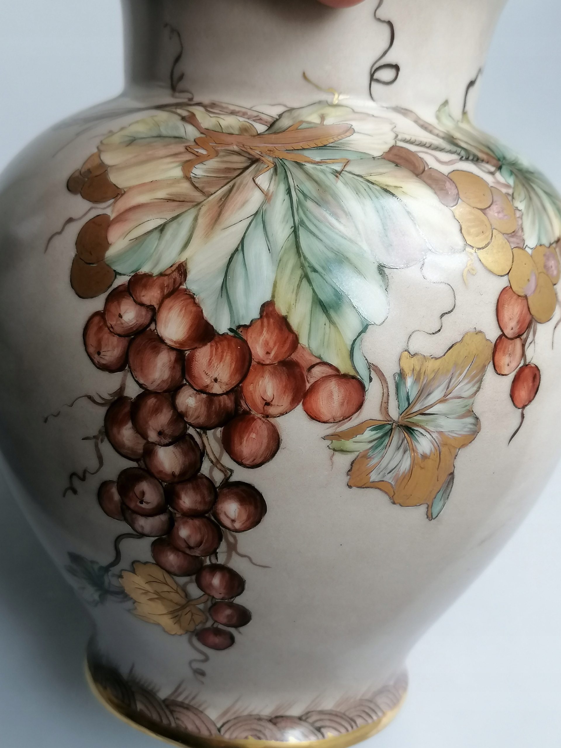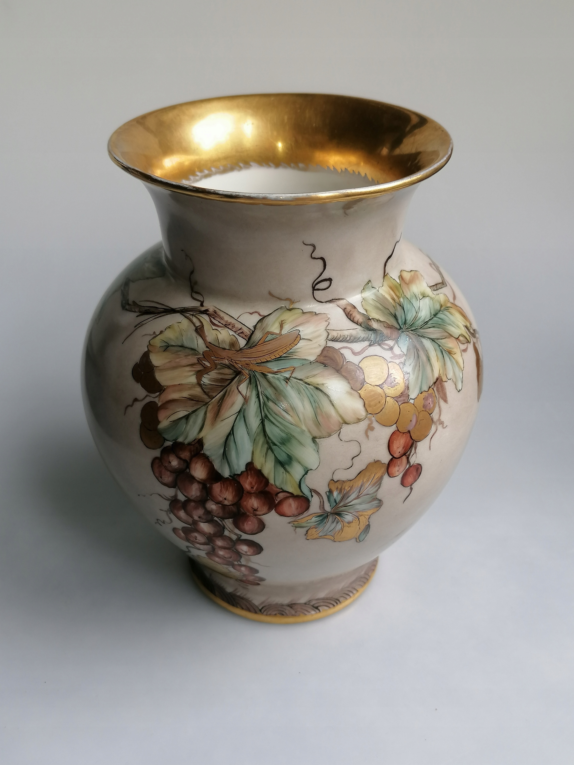 Niezwykle dekoracyjny, elegancki i efektowny, wykonany ze szlachetnej porcelany, ozdobiony pięknymi, ręcznie wykonanymi malunkami oraz złoceniami. Wazon w klasycznej pękatej formie, porcelana w stonowanym kolorze kawy z mlekiem, pięknie przyozdobiony motywem roślinnym oraz niezwykle realistycznie wykonanymi owadami. To zarówno ozdoba , jak i funkcjonalny element, idealnie eksponujący ulubione kwiaty.