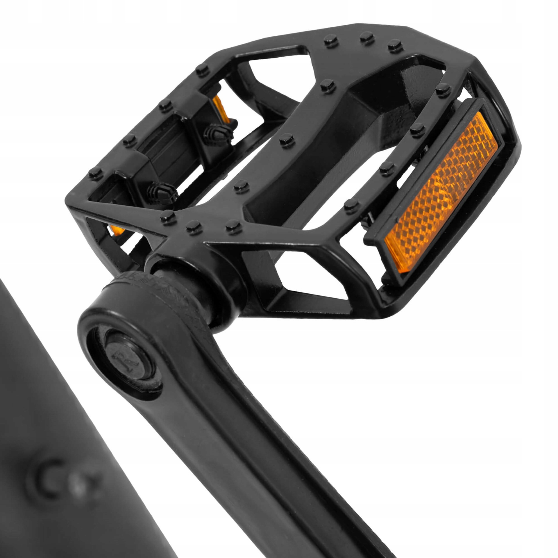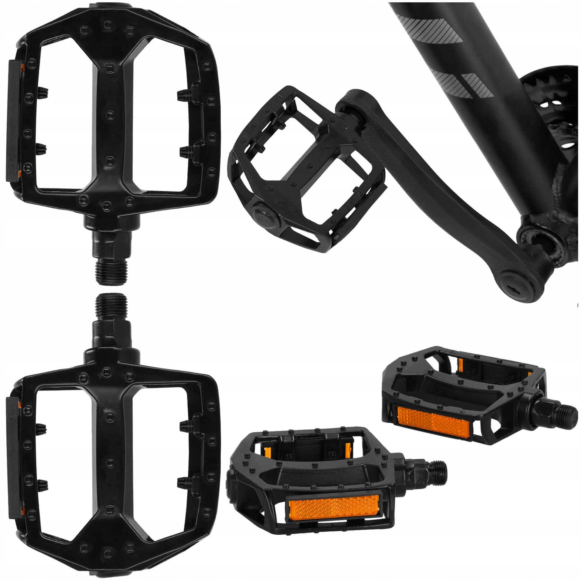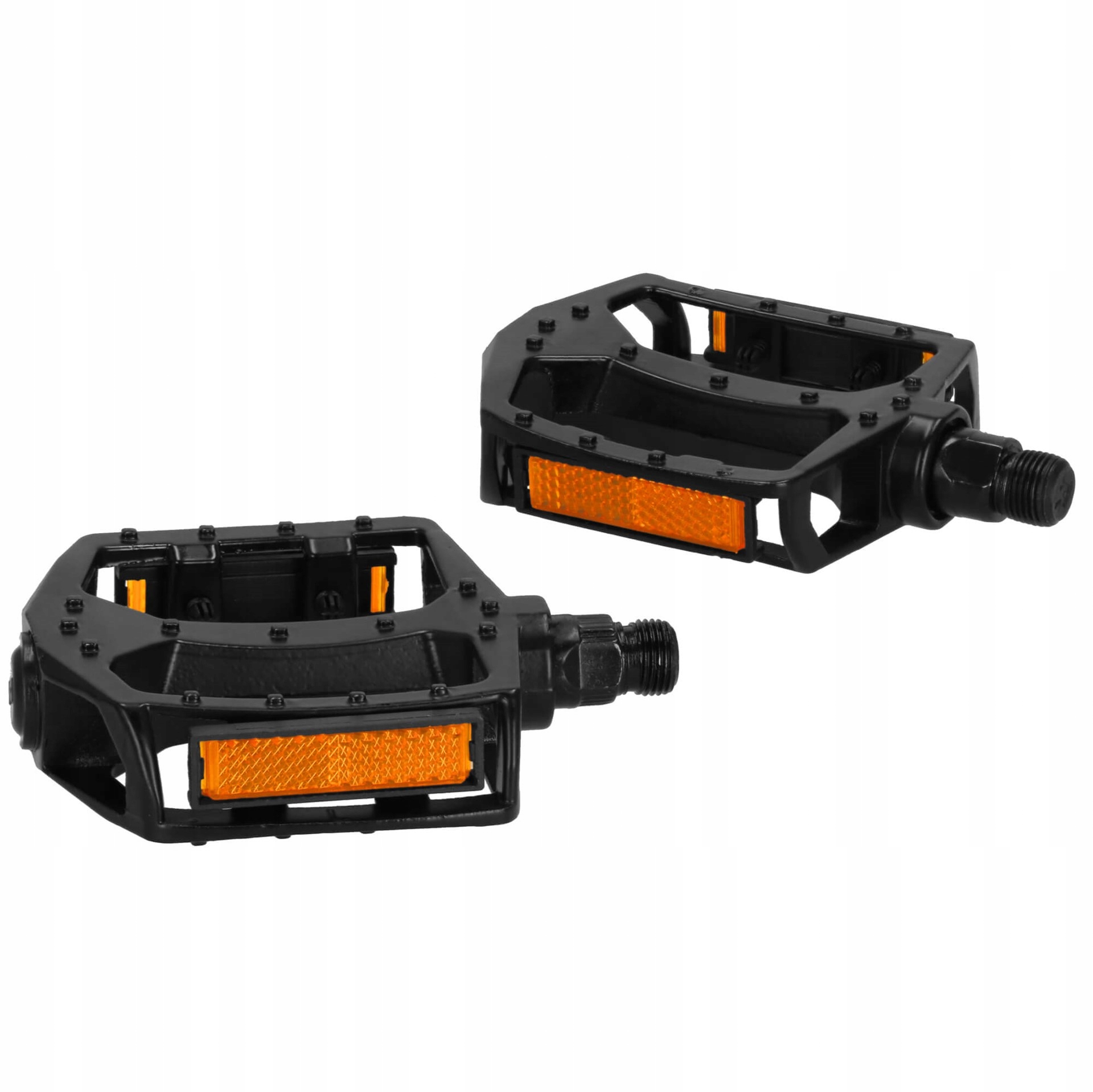 Dzięki antypoślizgowej powierzchni pedały gwarantują pewne trzymanie stopy, co jest niezwykle ważne przy dynamicznej jeździe. Dodatkowo, wbudowane odblaski w kolorze pomarańczowym zwiększają widoczność rowerzysty po zmroku, podnosząc poziom bezpieczeństwa.