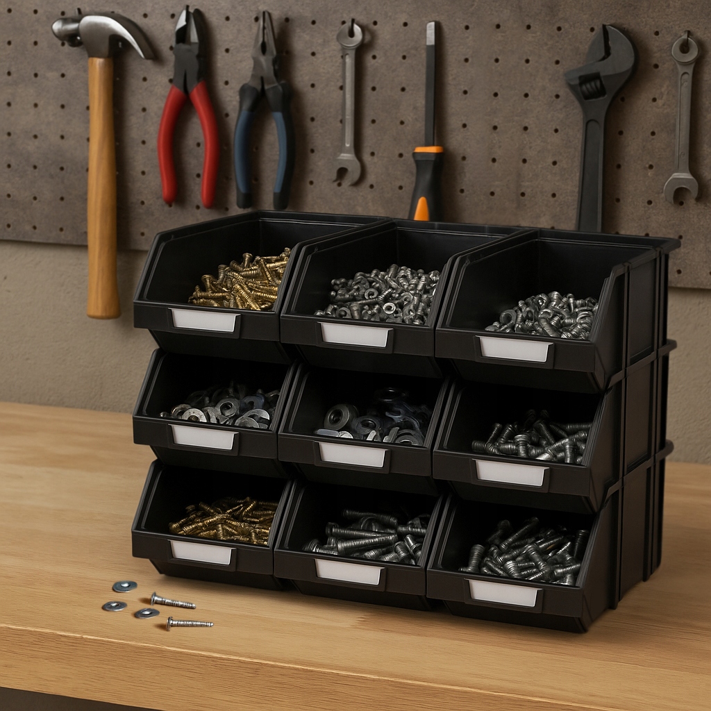 Do przechowywania drobnych elementów, takich jak śruby, nakrętki, wkręty, najlepiej sprawdzą się pojemniki mniejszych rozmiarów. Dzięki takiemu rozwiązaniu każdy element będzie miał swój pojemnik, a wszystko będzie na swoim miejscu.