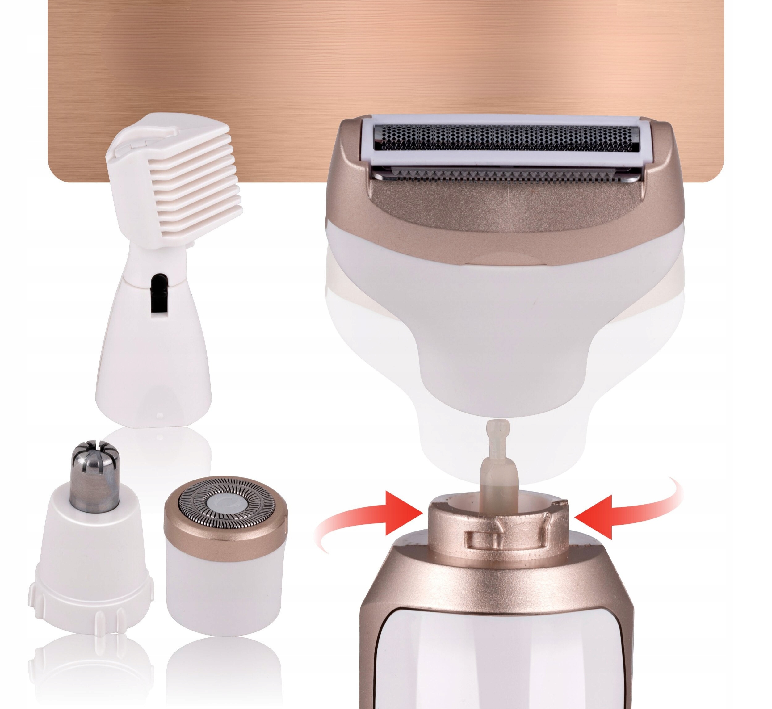 Trymer do nosa usuwa wystające włoski z nosa, a trymer do brwi przycina brwi. Wymiana nasadki jest prosta. Wystarczy obrócić i pociągnąć zamocowaną nasadkę. Nowa nasadka jest nakładana na golarkę damską. Następnie dociśnij go w dół, aby go zamocować.