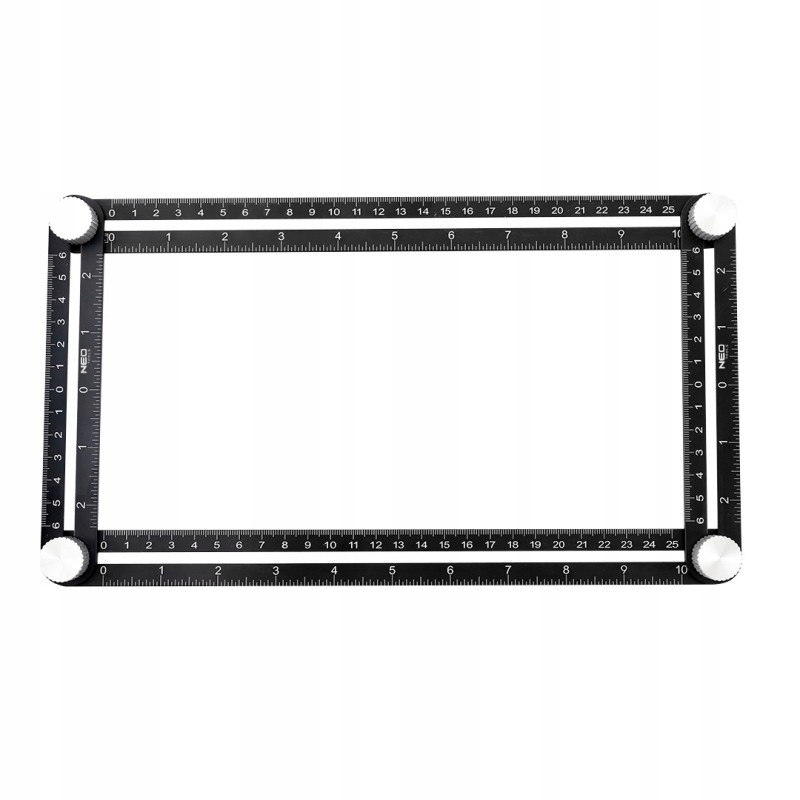 Linijka kątowa, 4 ramiona NEO (nr ref. 72-350) znajdzie zastosowanie w odwzorowywaniu i przenoszeniu kształtów. Posiada podziałkę w cm i calach. Wykonana została ze stopu aluminium. Dwie dłuższe linijki mają długość 25cm, krótsze ramiona z podziałką od 0 do 6 cm w obu kierunkach.