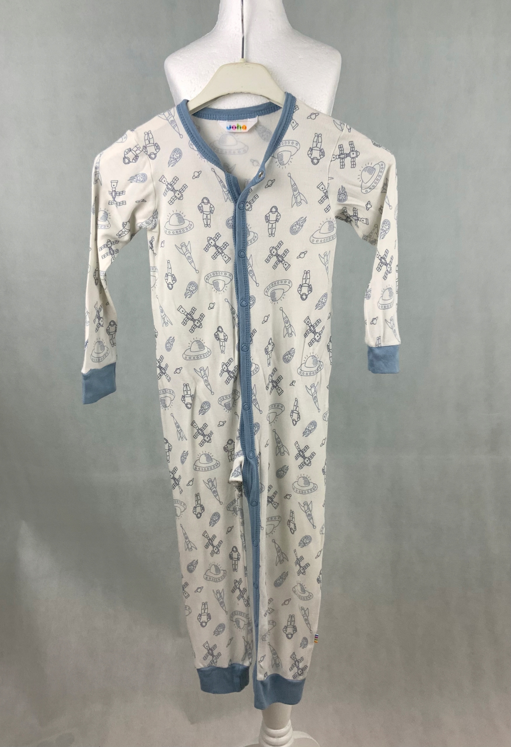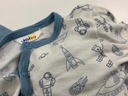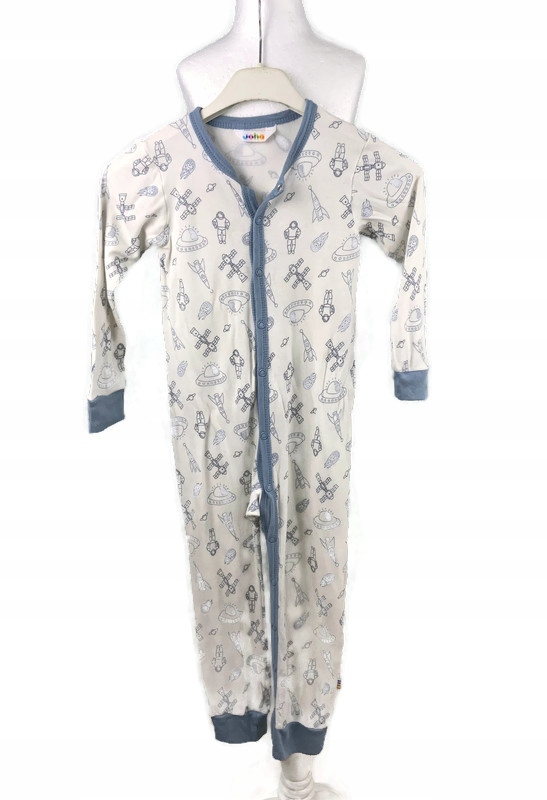 Miękki kombinezon, piżamka w kolorze śmietankowym z granatowo niebieskim kosmicznym printem. Zapinany na napy.