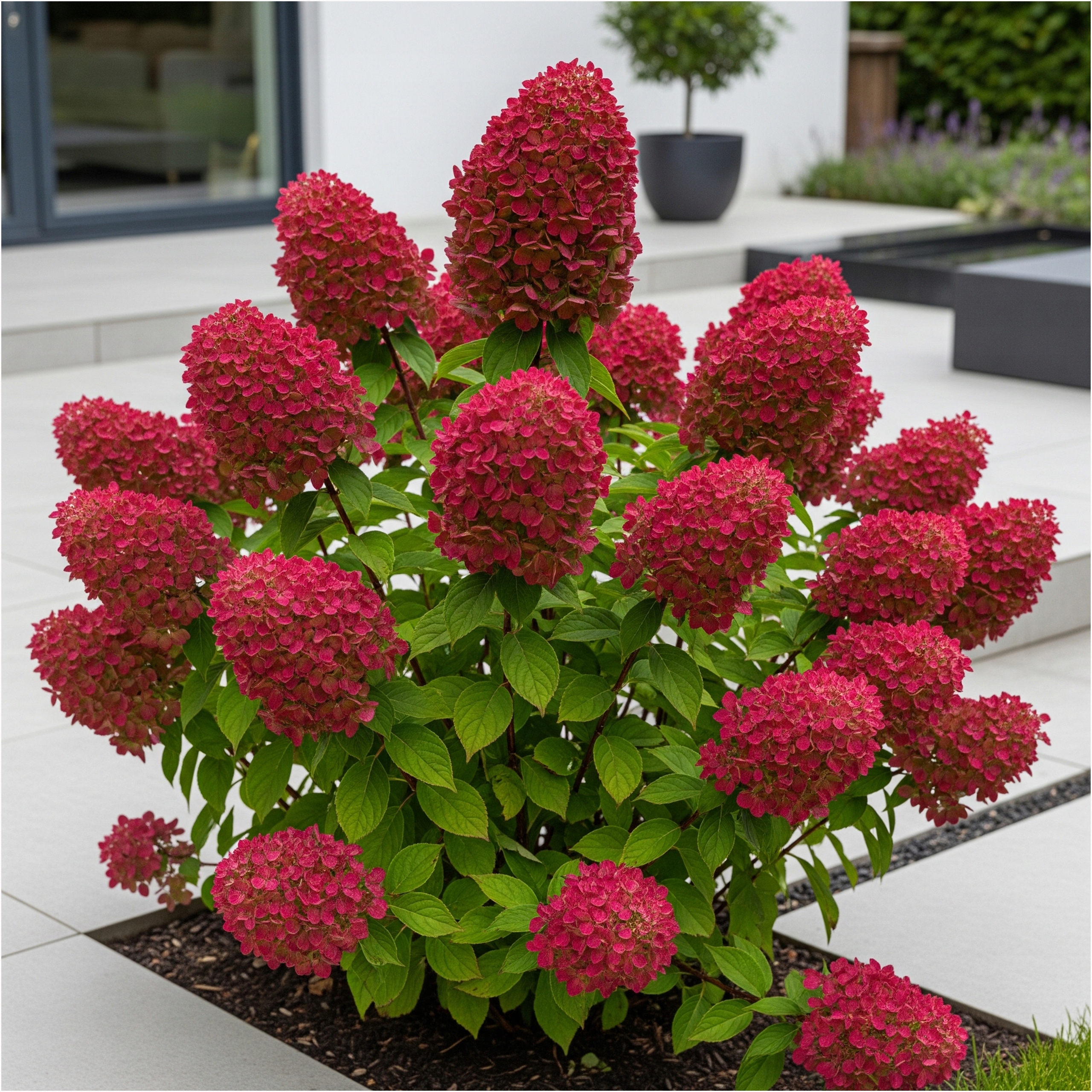 Этот уникальный сорт букетной гортензии впечатляет эффектной метаморфозой соцветий в в течение сезона. Его конические цветки сначала развиваются в кремово - белый оттенок, затем они приобретают розовые тона, чтобы к концу лета достичь ярко-красного и вишневого цвета. Благодаря эта красочная трансформация является уникальным украшением сада с июня до осени.