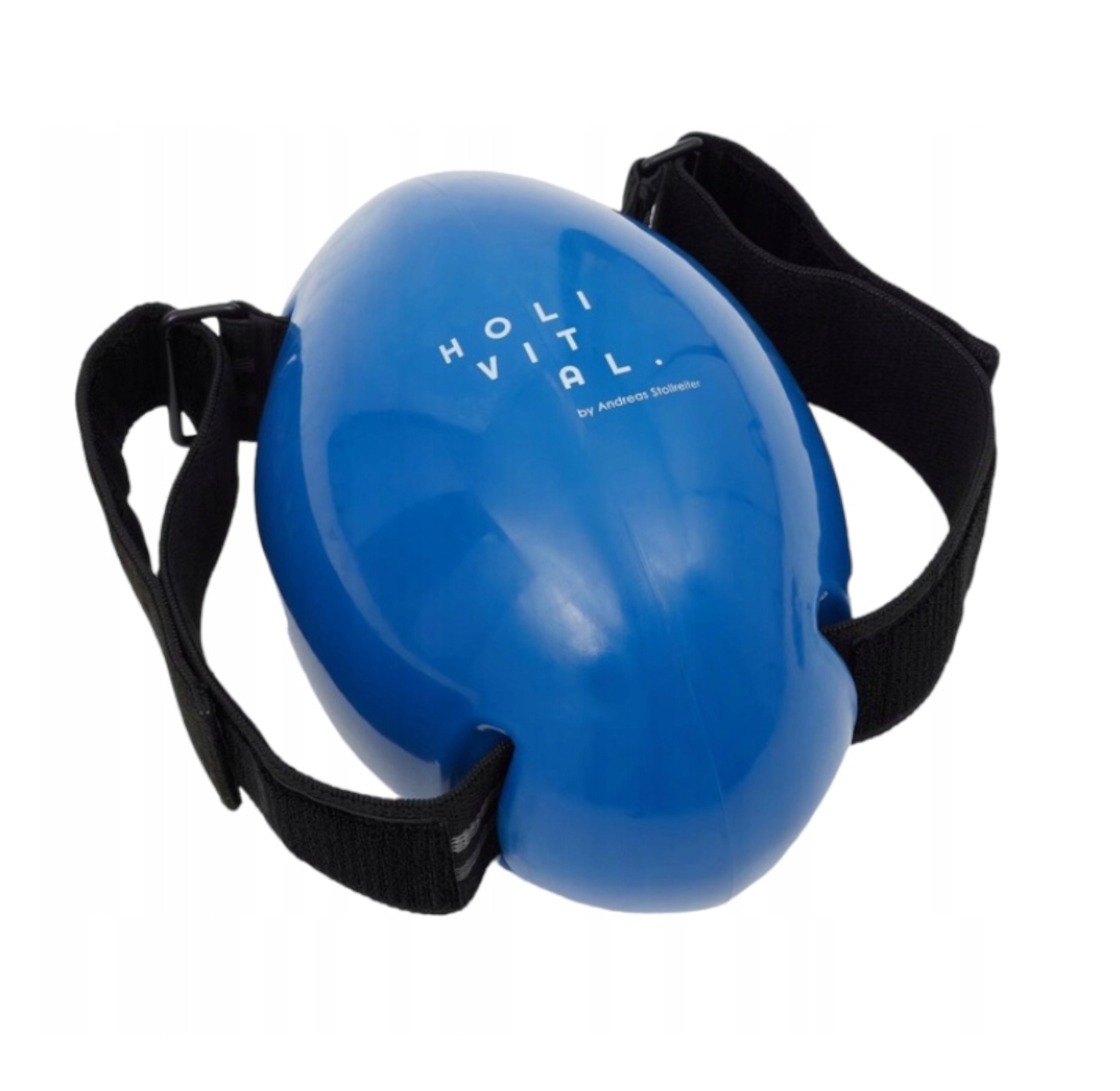 Dzięki elastycznemu mocowaniu, piłka jest utrzymywana między udami. Mężczyzna ćwiczy poprzez rytmiczne zaciskanie i rozluźnianie mięśni, co daje realny opór i wymusza zaangażowanie odpowiednich partii ciała.