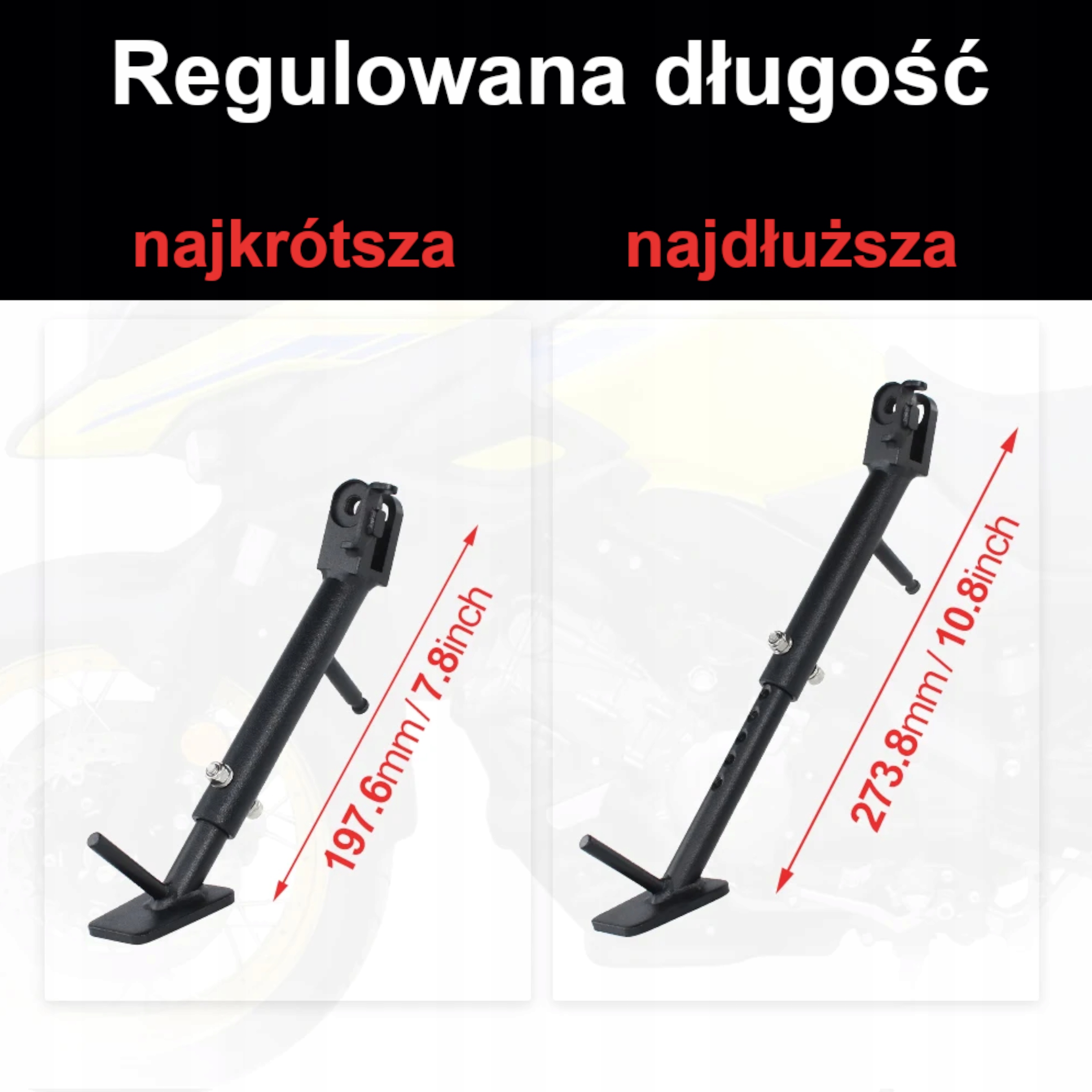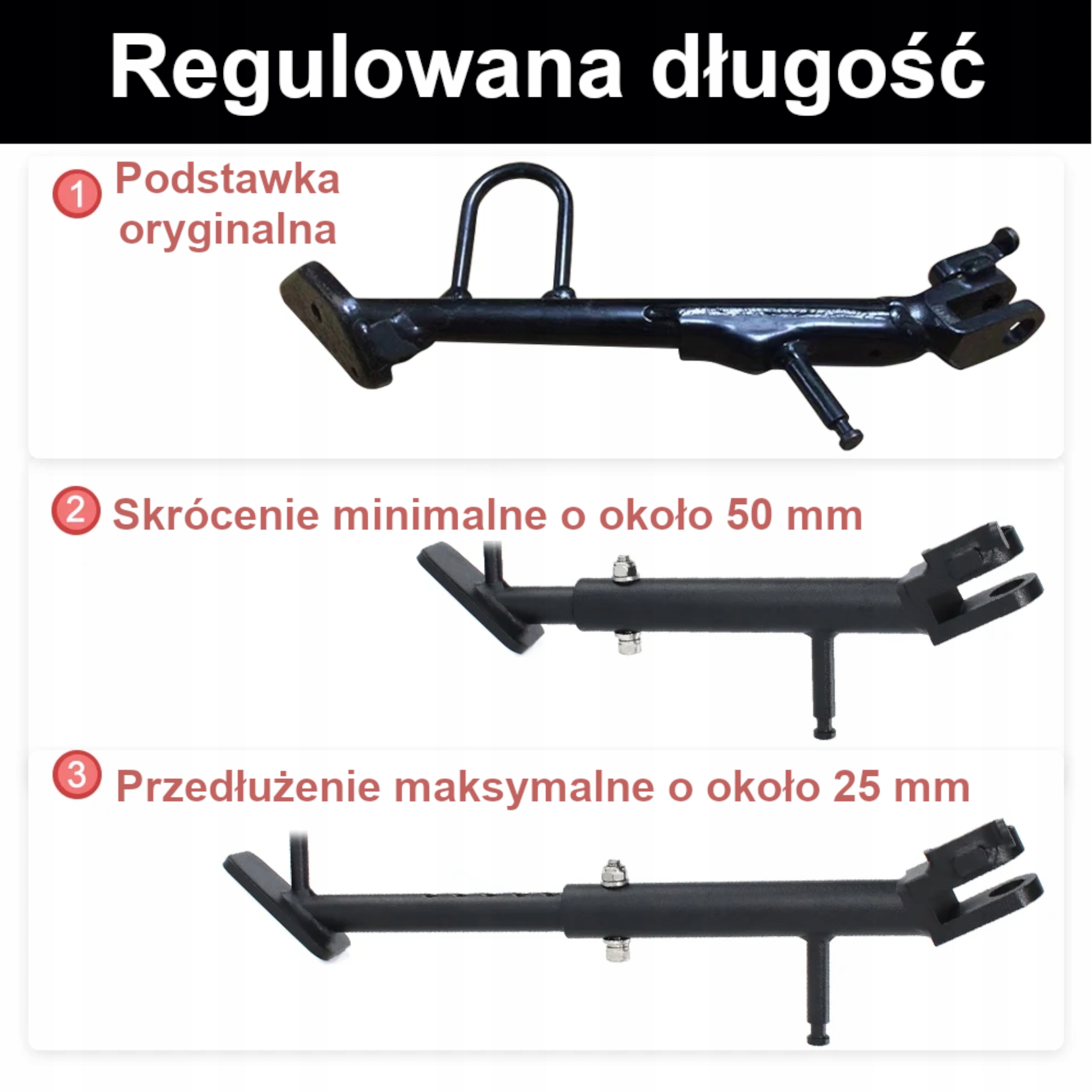 W przypadku obniżenia lub podwyższenia zawieszenia motocykla, konieczna staje się modyfikacja oryginalnej podpórki bocznej. Bez zmiany długości podparcia, motocykl może stać niestabilnie (zbyt pionowo lub płąsko) co może grozić przewróceniem maszyny na postoju.