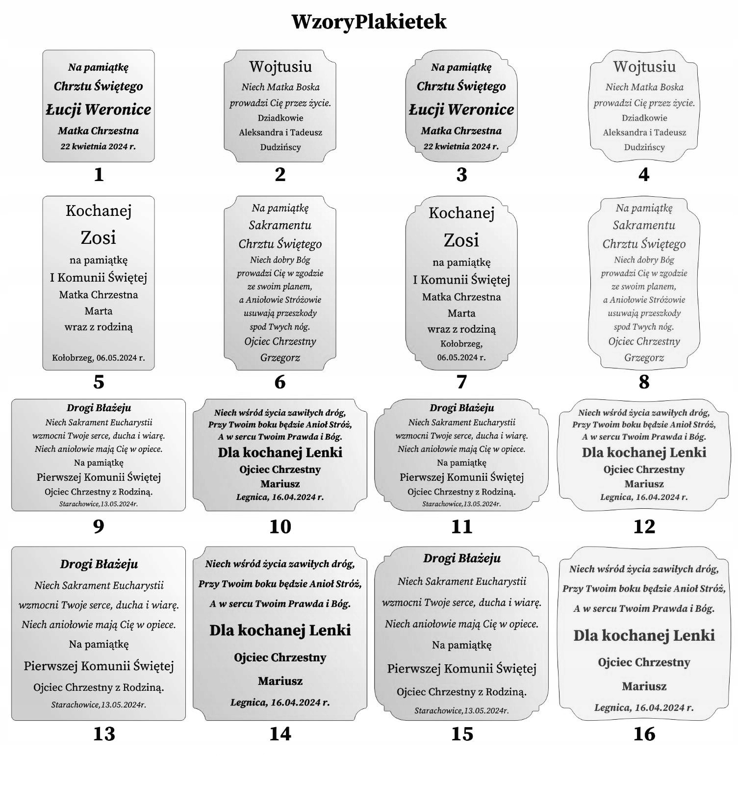 UWAGA! Nie poprawiamy błędów ani nie przepisujemy przykładowych treści czy wierszyków z plakietek pokazanych jako wzornik! Na plakietce zostanie wygrawerowane dokładnie to, co zostanie przesłane w wiadomości jako dedykacja.