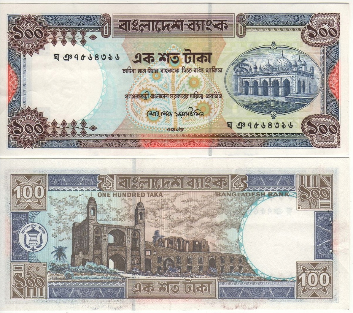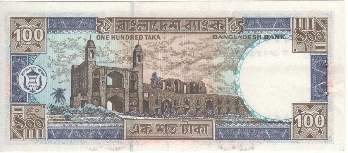 Przepiekny banknot 100 Taka z Bangladesz - 1992r. (P31e) w stanie bankowym I (UNC) (ślad po zszywce bankowej).