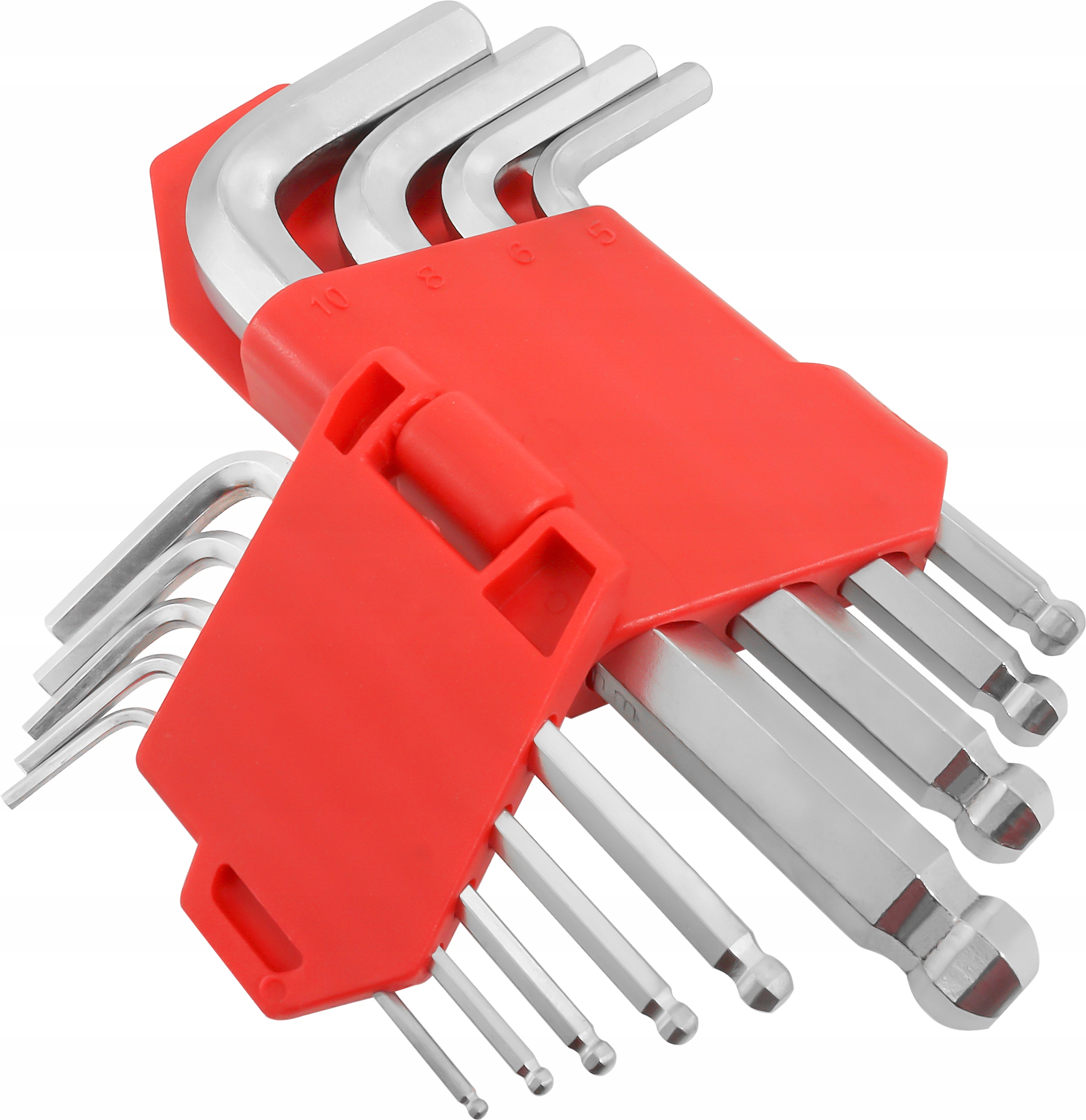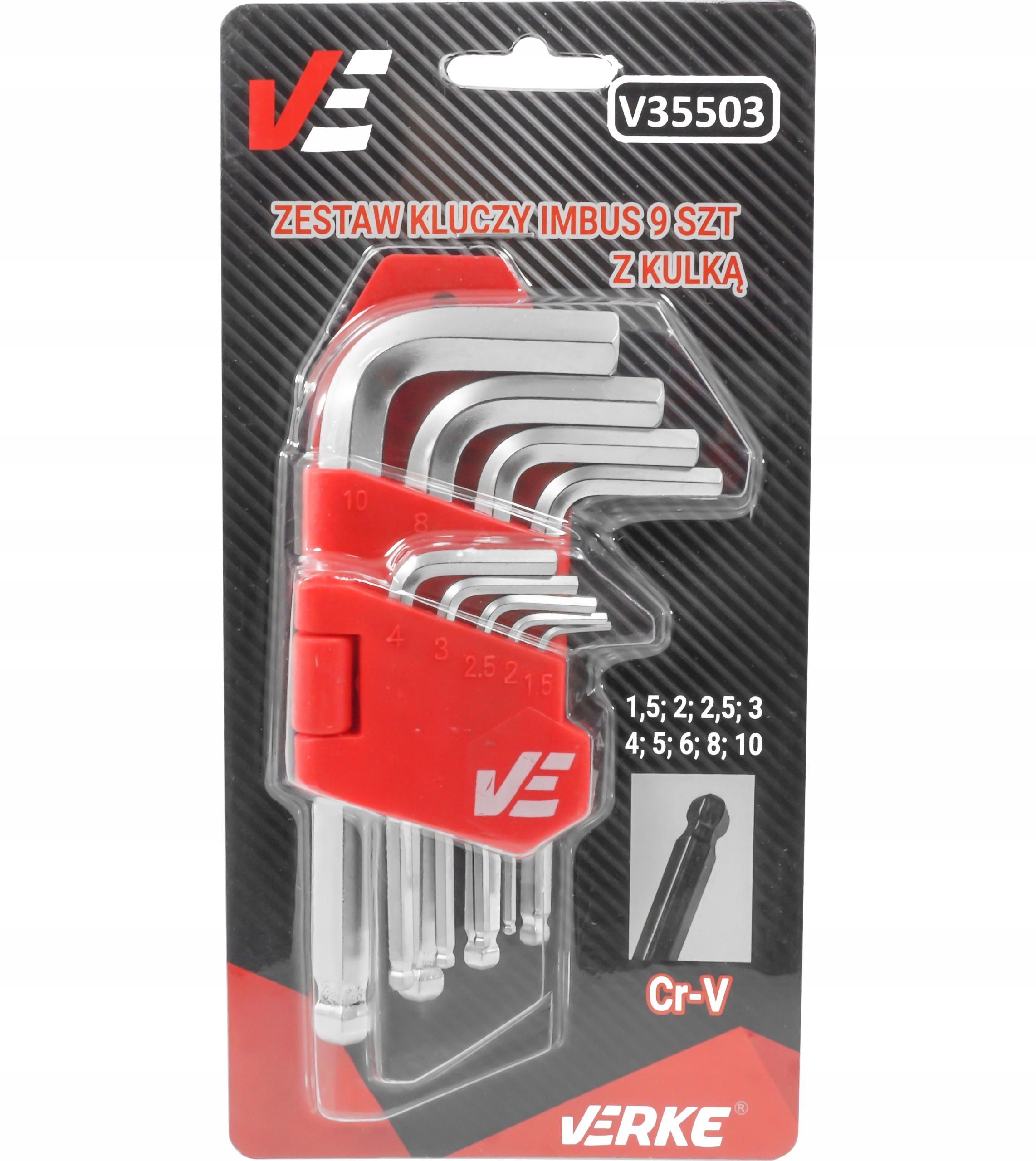 Idealny zestaw kluczy z końcówką IMBUS hex. Zestaw zapakowany w praktyczną i poręczną zawieszkę z tworzywa sztucznego, która ułatwia wyszukanie odpowiedniego rozmiaru klucza. Klucze wykonane z wysokiej jakości stali chromowo wanadowej CrV, charakteryzującej się wytrzymałością oraz sprężystością. Końcówka klucza zakończona została kulką, która umożliwia pracę pod kątem.