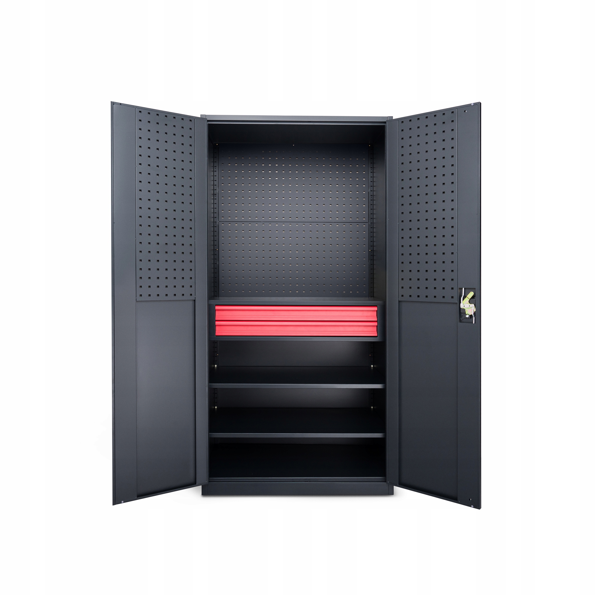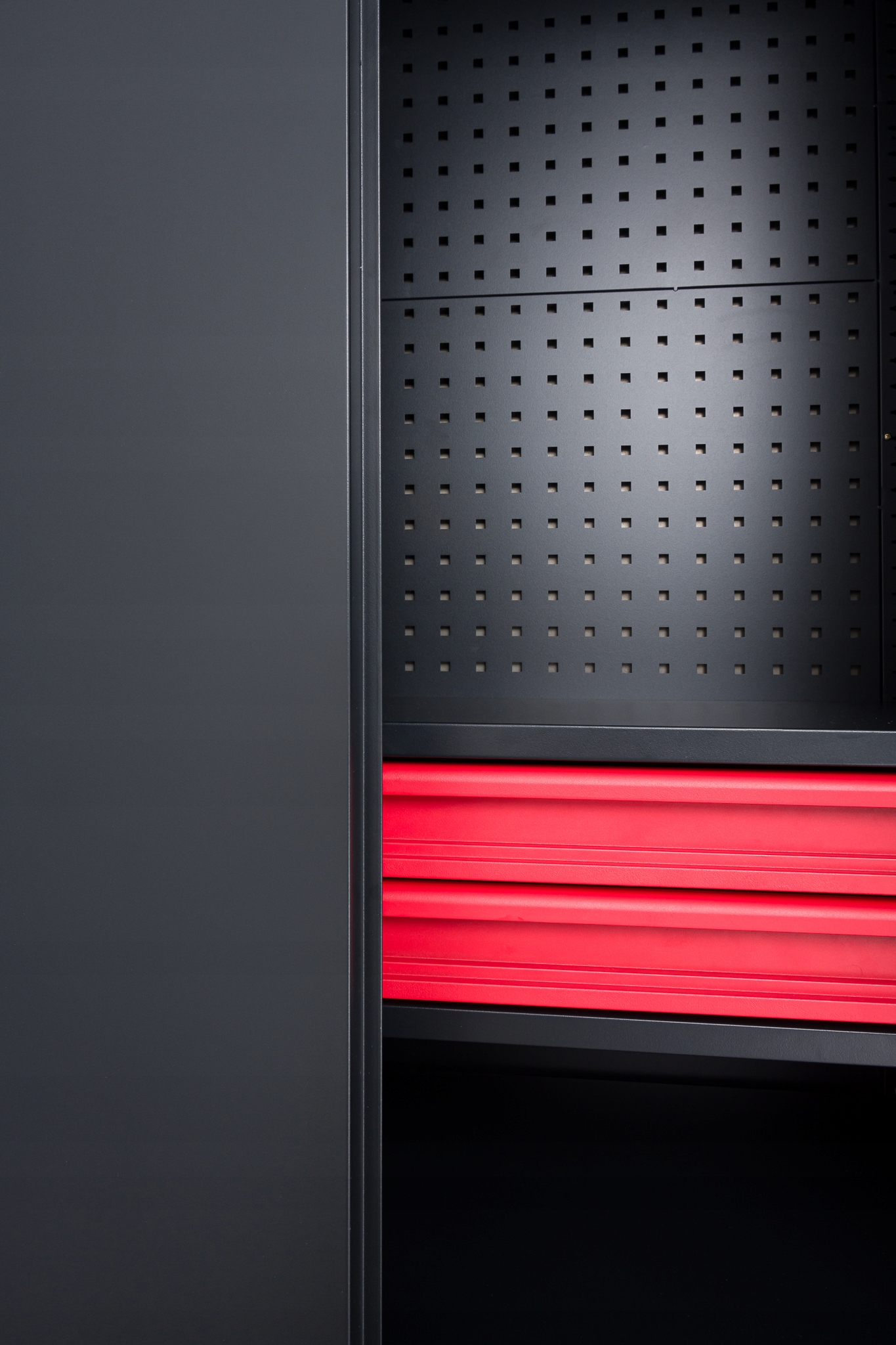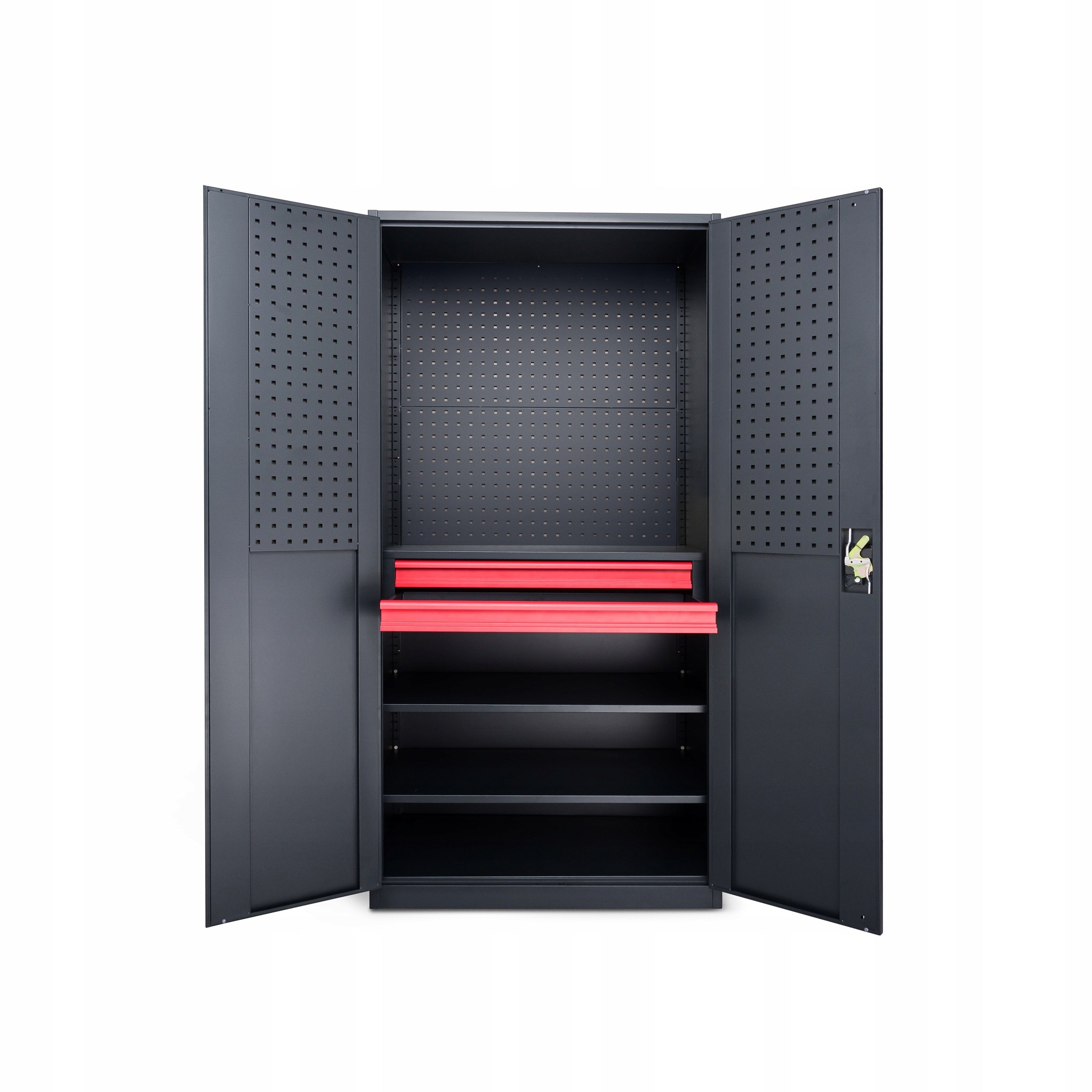 Szafa wyposażona jest w 3 stabilne półki oraz dwie szuflady na solidnych prowadnicach. Komora przechowywania posiada perforowane ścianki które umożliwiają elastyczne dostosowanie do potrzeb użytkownika. Solidna i stabilna konstrukcja szafy w połączeniu z wysokiej jakości 3 punktowym zamkiem zapewniają ochronę przed dostępem nieuprawnionych osób.