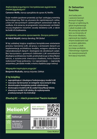 W tej unikalnej książce znajdziesz kompleksowe omówienie procesu tworzenia LLM, od pracy z zestawami danych po implementację architektury modelu, wstępne szkolenie na nieoznakowanych danych i dostrajanie do określonych zadań. Bez korzystania z gotowych bibliotek LLM samodzielnie zbudujesz podstawowy model, przekształcisz go w klasyfikator tekstu, a ostatecznie stworzysz chatbota, który będzie wykonywał Twoje polecenia. I co najważniejsze - naprawdę zrozumiesz, jak działa model, w końcu będziesz jego twórcą!