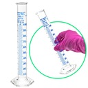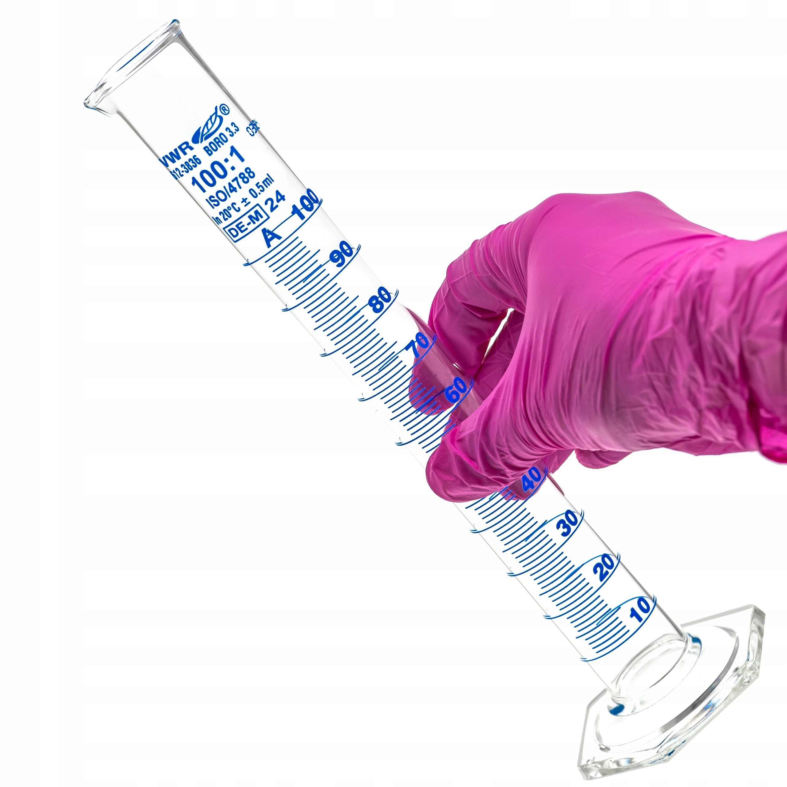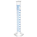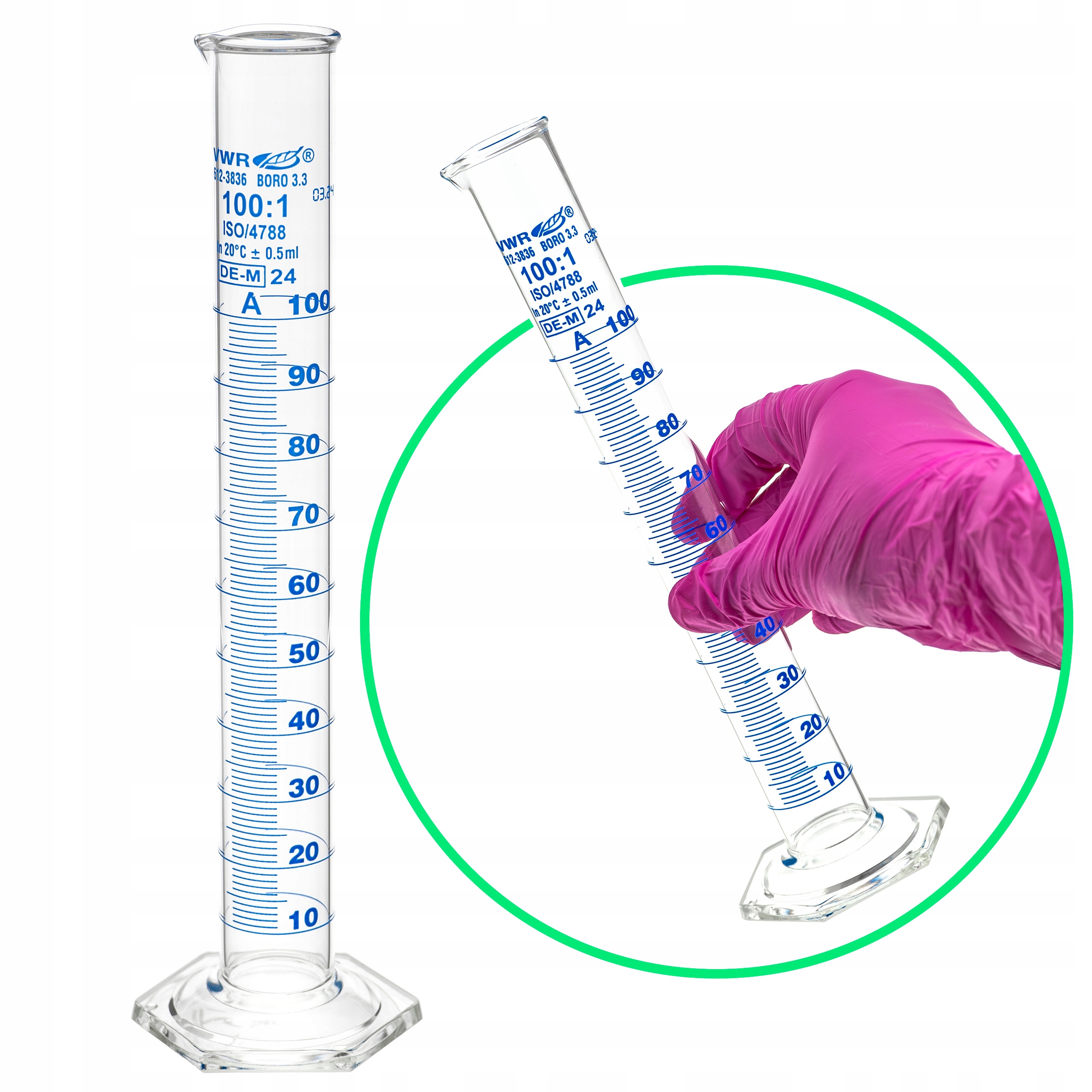 Cylinder miarowy z wylewem o pojemności 100 ml, wykonany ze szkła borokrzemowego 3.3. Jest odporny na działanie gorącej wody, kwasów oraz roztworów zasadowych. Wyraźna skala o dokładności 1 ml została naniesiona kolorem niebieskim. Stopka sześciokątna ze szkła zapewnia stabilną pracę.