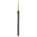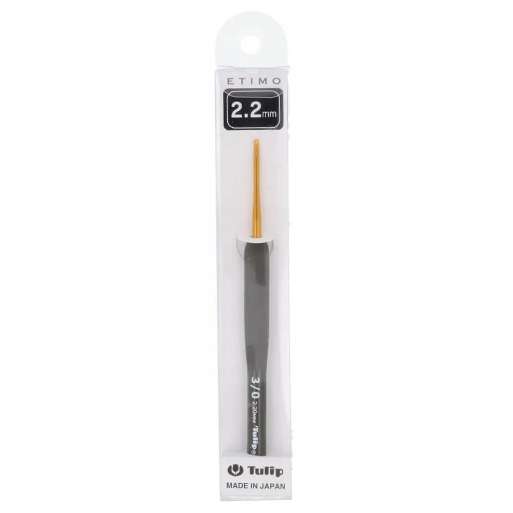 Japońskie, wysokiej jakości szydełko Tulip Etimo to złote szydełko z szarą ergonomiczną rączką.