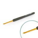 Japońskie, wysokiej jakości szydełko Tulip Etimo to złote szydełko z szarą ergonomiczną rączką.