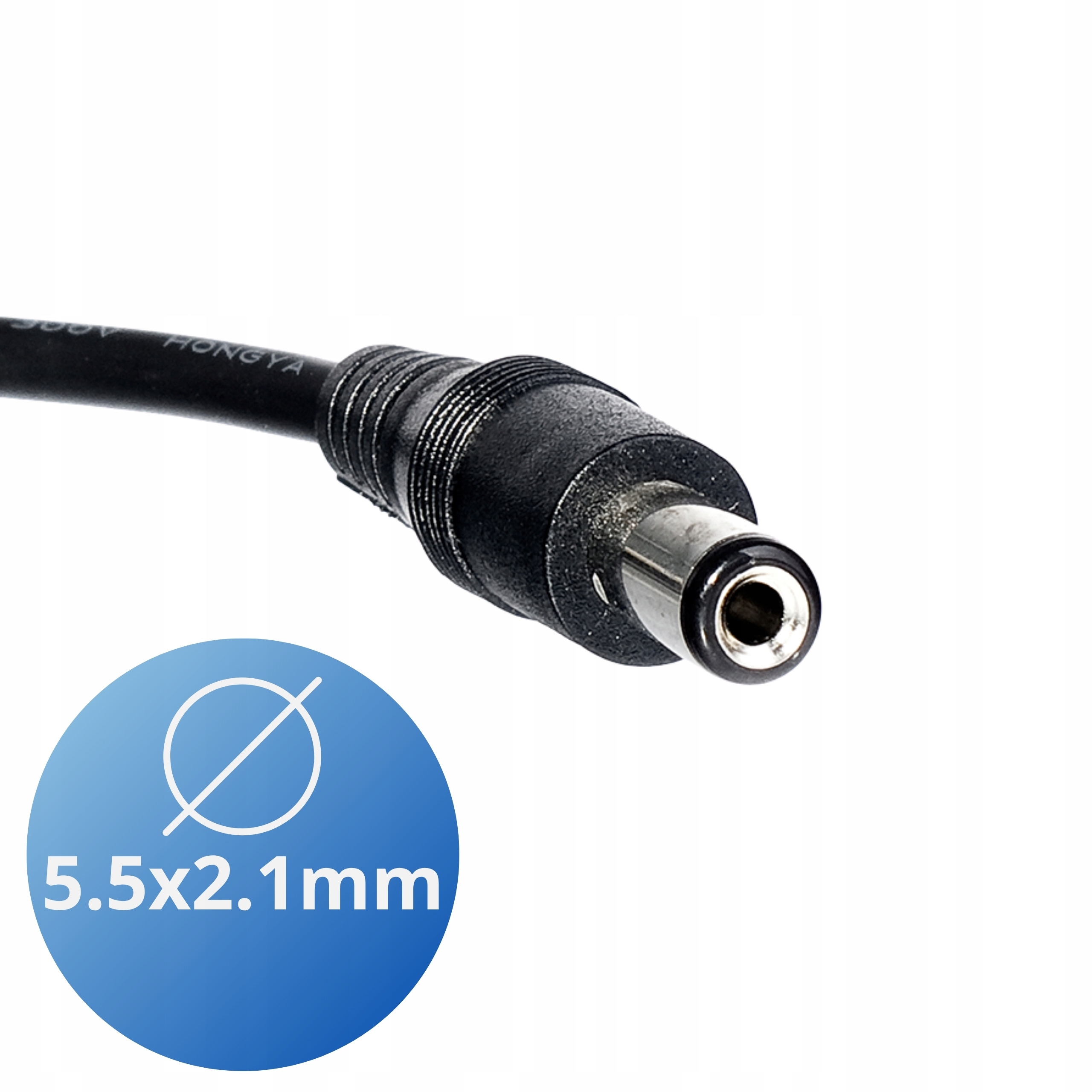 Przewód zasilający zasilacza zakończony jest popularną wtyczką typu DC o średnicy zewnętrznej 5,5 mm i wewnętrznej 2,1 mm, co umożliwia łatwe i szybkie podłączenie do większości urządzeń wymagających zasilania 12V DC. Tego typu złącze jest powszechnie stosowane w systemach monitoringu, co zapewnia kompatybilność z wieloma modelami kamer i innych urządzeń elektronicznych.
