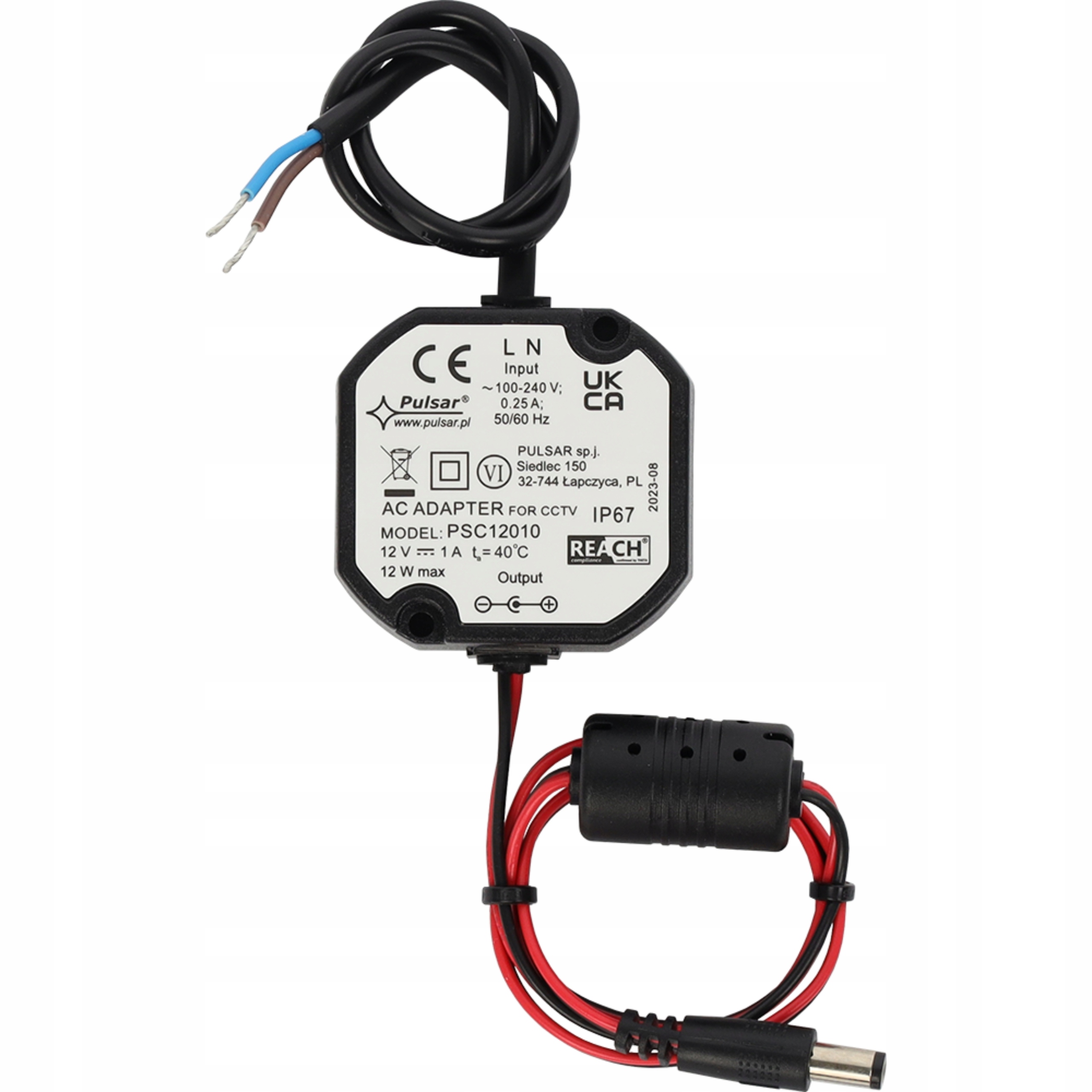 Zasilacz model PSC12010 służy do zasilania kamer przemysłowych napięciem 12V DC, pobieranym z sieci 240V AC. Może być instalowany zarówno w puszkach natynkowych, jak i podtynkowych, a także przymocowany za pomocą wkrętów o średnicy 3 mm. Urządzenie posiada zabezpieczenia chroniące przed zwarciem, przeciążeniem oraz przepięciem.