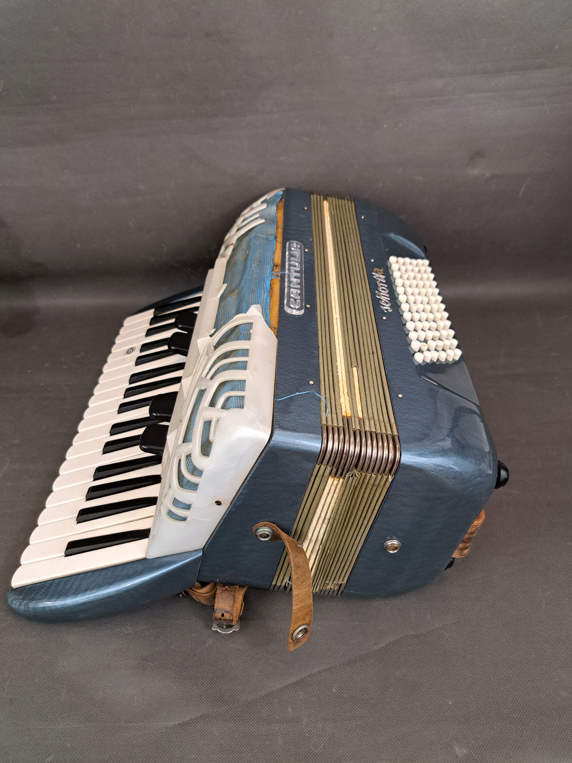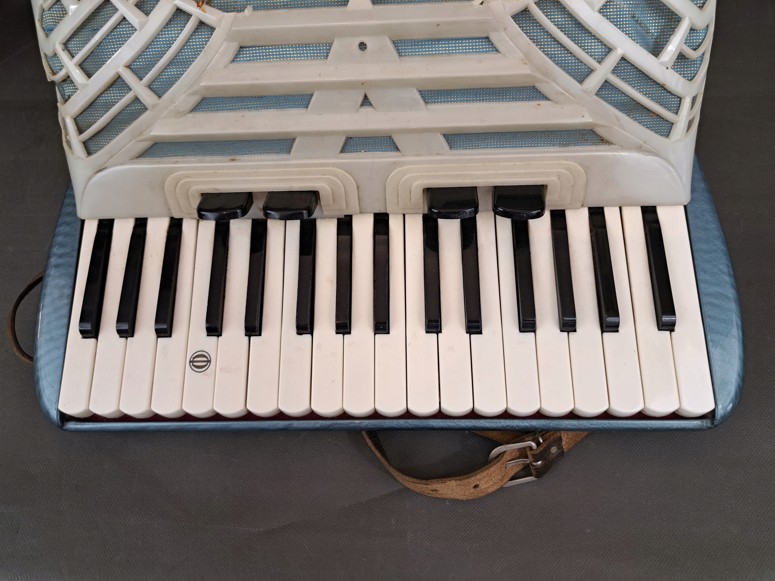 Instrument wymaga renowacji. Miech jest posklejany, występują ubytki plastiku, przedarcia materiału, przetarcia, zabrudzenia.